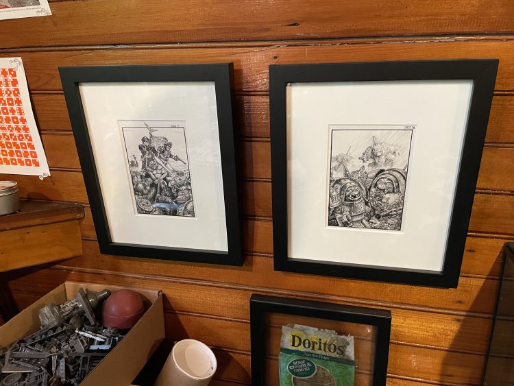 The walls hold some very old and very cool posters, some of which I've had framed, prints from Nerdgore, and with a few pieces of original GW art from Tony Hough. I have a small collection old GW mugs (there's a couple out there that I'd still love to get, hot wheels and loads of other stuff. I even had a friend hook me up with the cardboard Thunderbolt. The sheepshead mask is from a TV commercial that was shot at the last advertising agency I worked at.