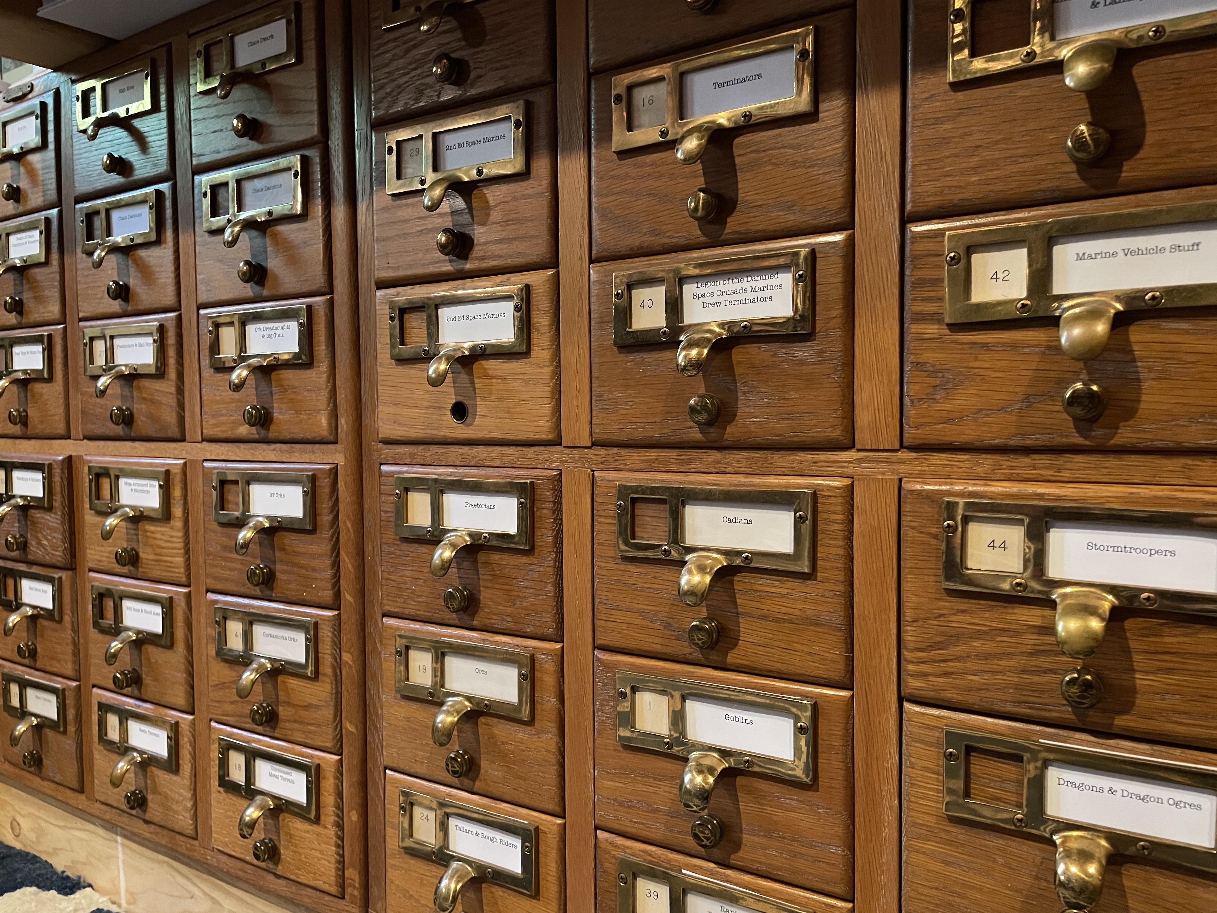 On the wall to the right sits a pair of card catalogs which were gifted to me from a friend. These contain all my loose metal miniature, which is a massive collection encompassing pretty much every sculpt that was produced for Warhammer 40k from 1988-1997. I used to have them in flat cardboard boxes, which was fine, but not very visually attractive, nor easy to find everything quickly without having to moved a bunch of stuff. Every drawer is labeled which makes finding everything very easy. On top sits an old butcher block and that's been designated for all my work in progress projects. Large terrain pieces that I'm taking a break from while I work on other stuff, minis waiting attention, etc. Also on there is a little display box that has a Bandai marine, a McFarlane Marine and one of the old Sideshow Collectable marines. Above sit the empty bottle of beer that you can get at Warhammer World, which a friend brought back from England years ago.