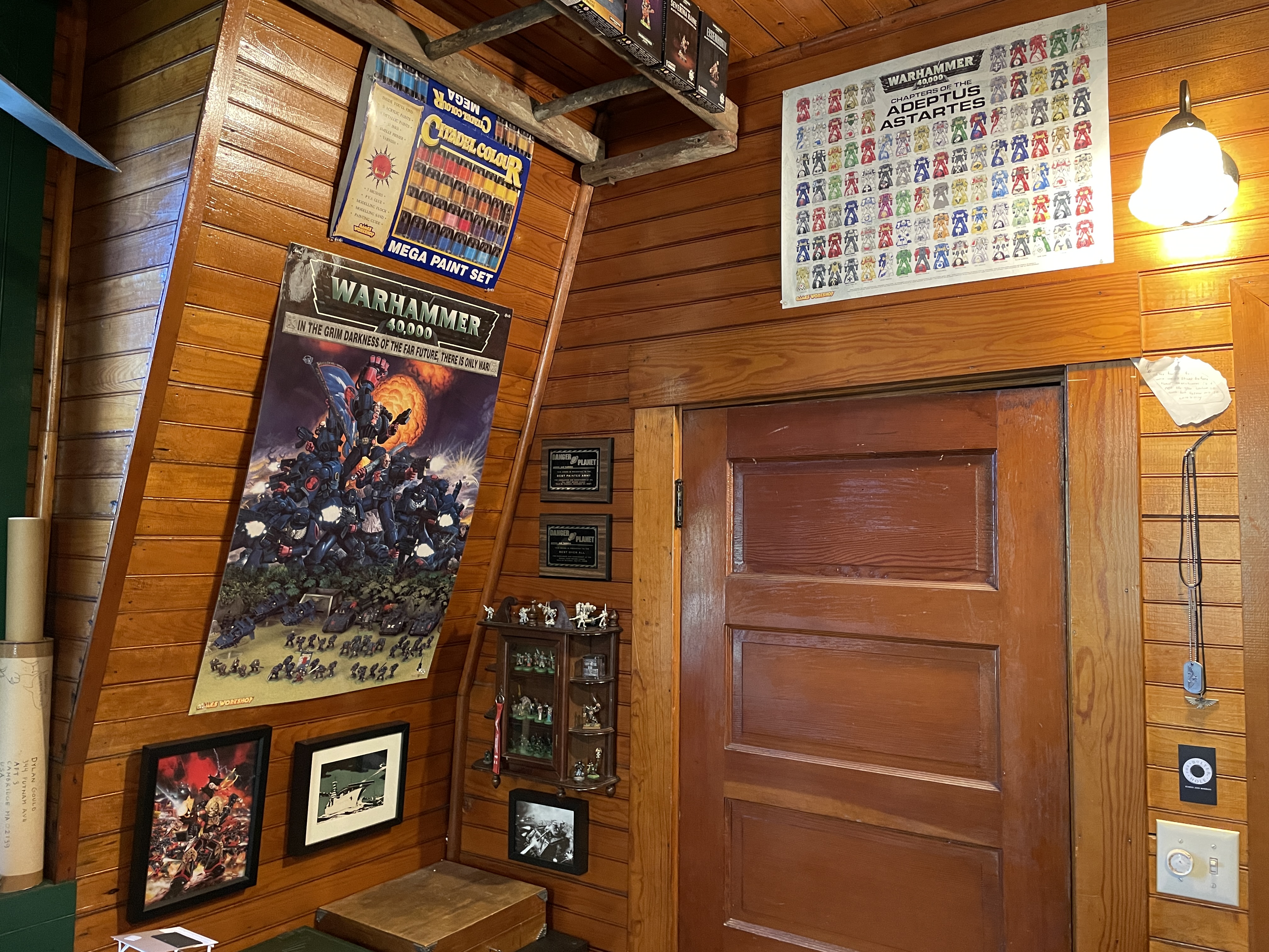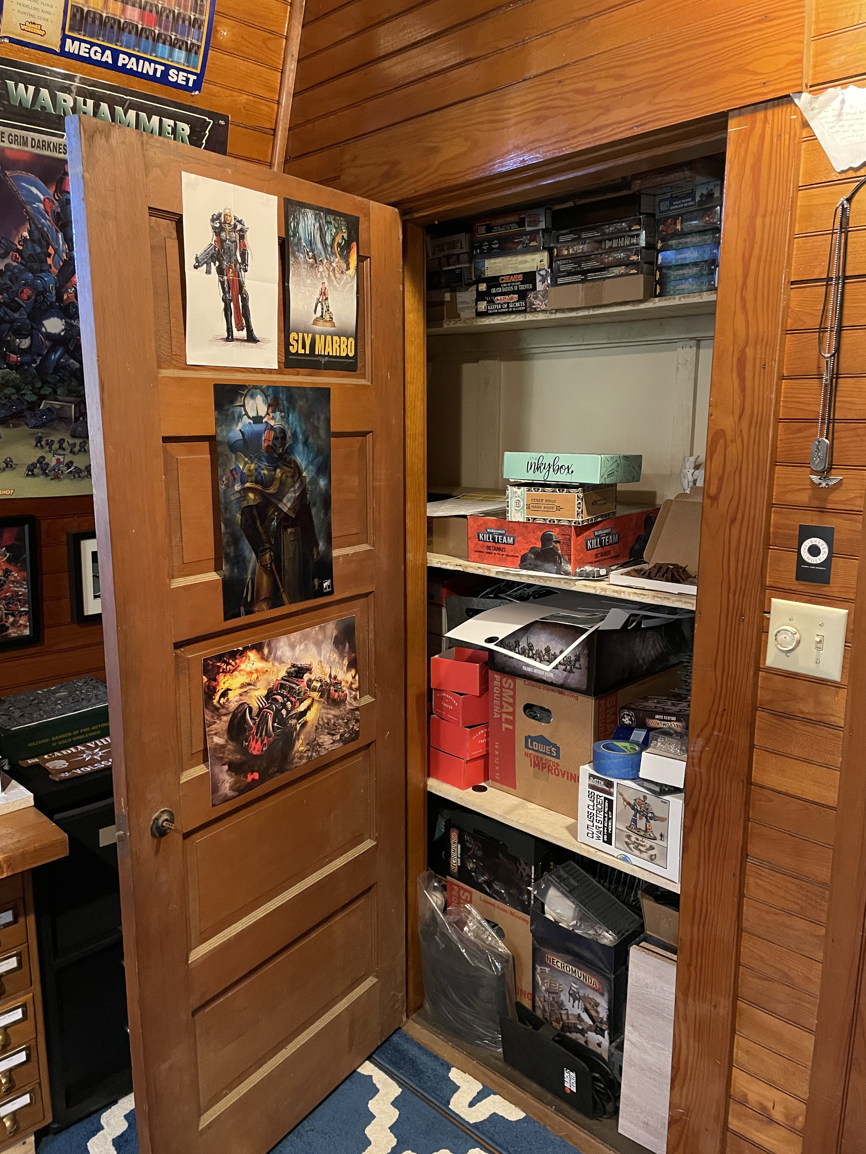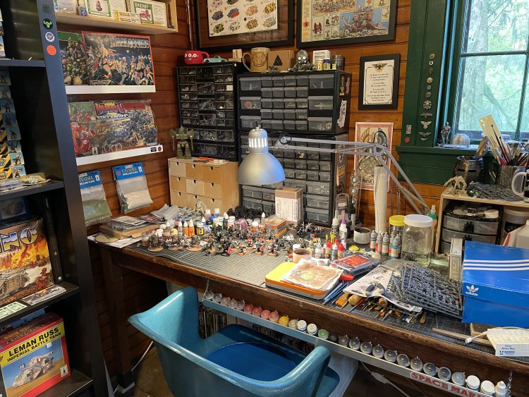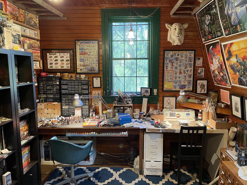 Walking into the hobby room you're greeted by my hobby area. My desk is nearly 10 feet long and is made from a WWII camp desk and an Ikea desk. It's the same setup I had in my last space, and fits perfectly. It allows me to have a dedicated painting and assembly station so I can bounce between projects and leave WIP stuff out. I added a rack to the front of the desk for my most-used paints and there's room for my bits organizers and tools so everything is easily at hand. I have an Ikea rolling drawer unit that holds the rest of my paint, rivets, and assorted tools. My paint collection runs the gamut from early 90s to modern stuff.