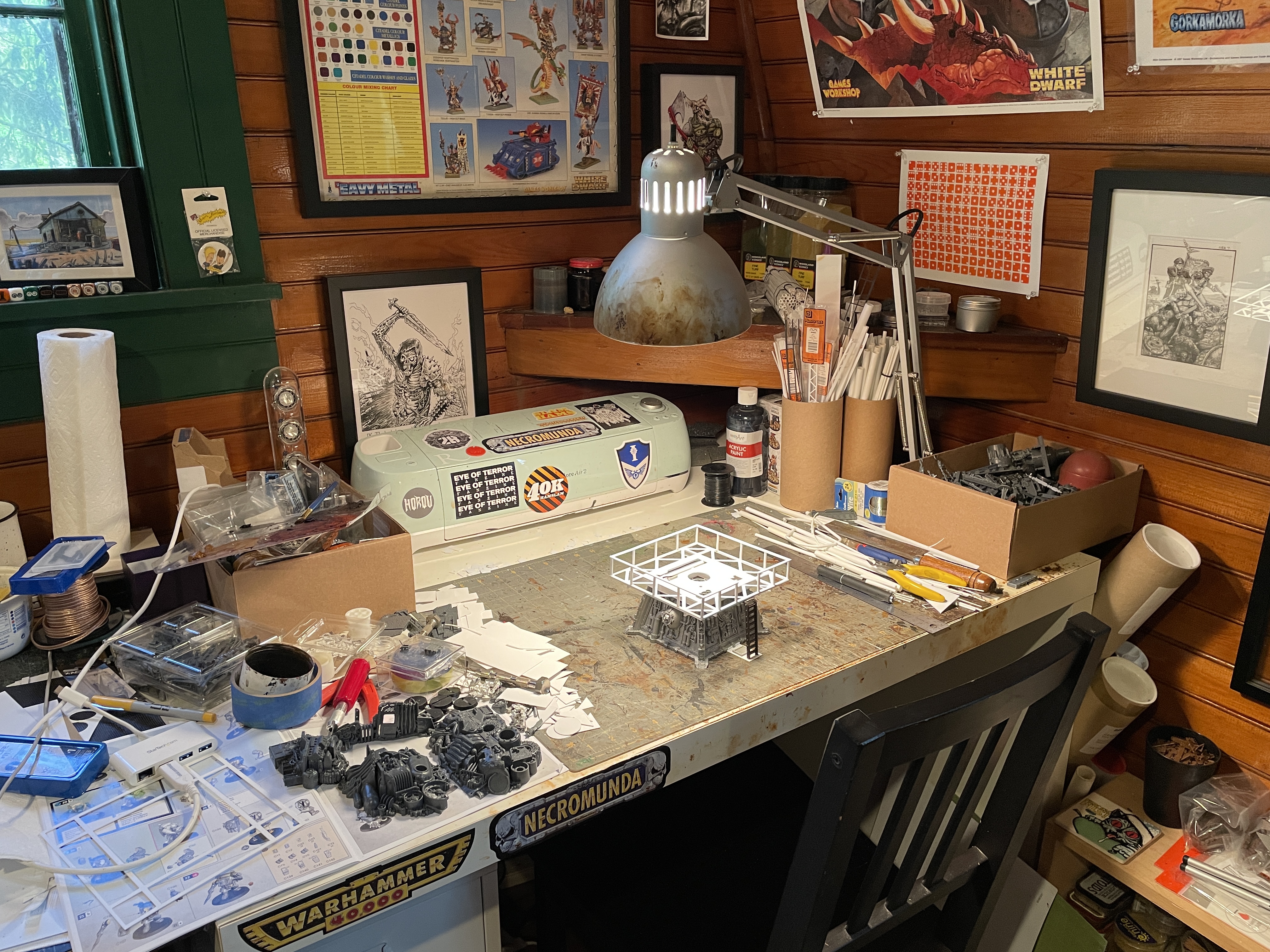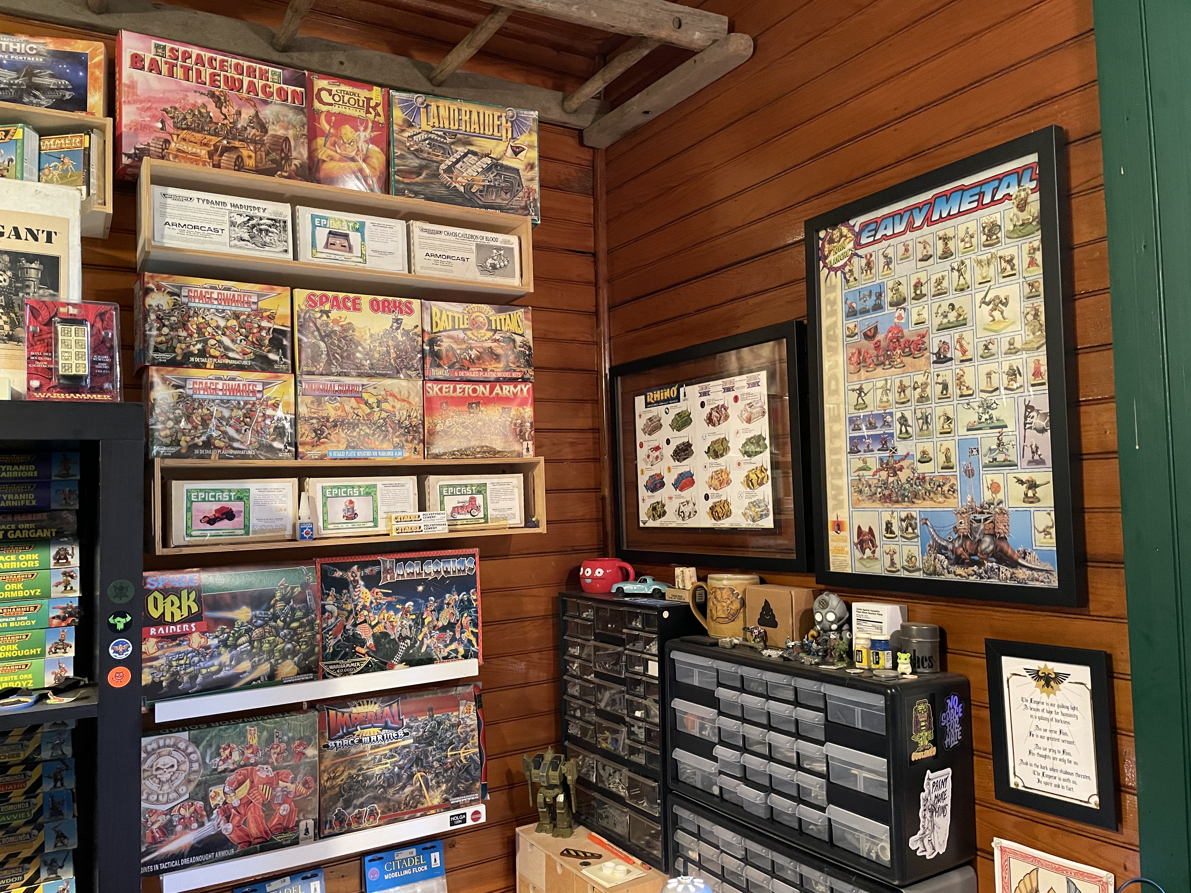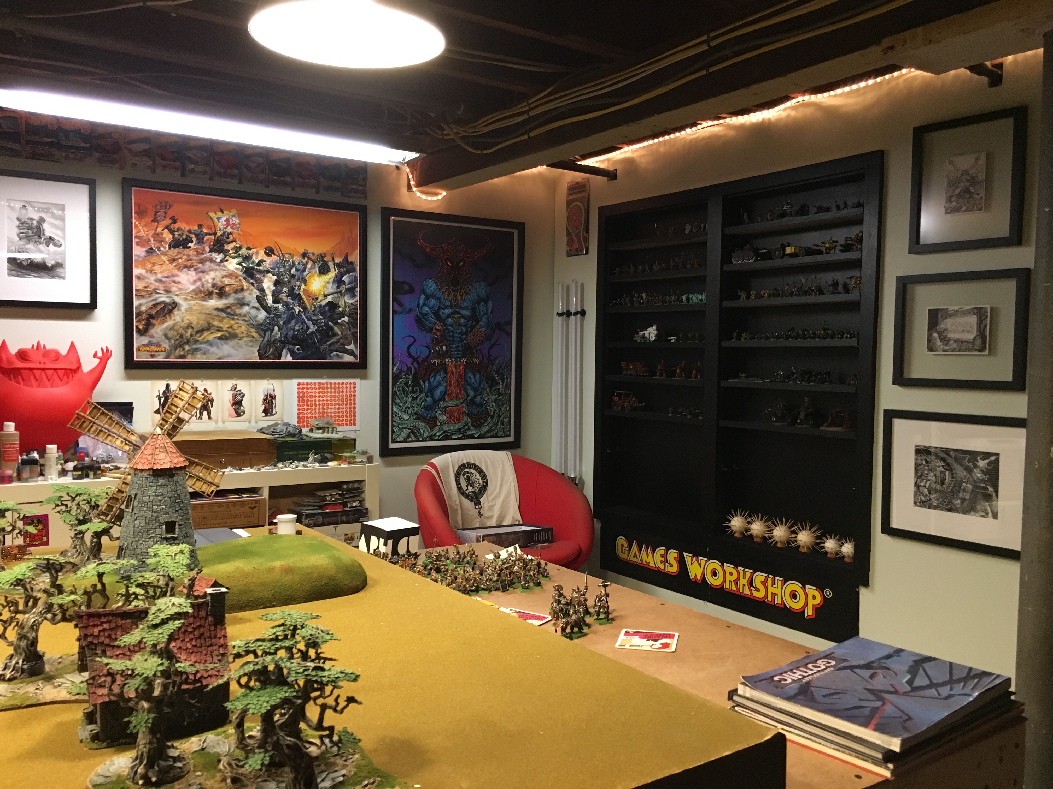 One wall is just bookcases and contains what I refer to has "The Archive". It's my collection of old White Dwarf magazines, ranging from issue 90-300+, Citadel Journal, Warhammer Monthly, Inferno, the complete range of rule books and codecii from Rogue Trader and Second Edition 40k, and various other Warhammer adjacent reference and art books. Also housed are a selection of new in box kits from the mid-90s and all my large box games. On the top is a variety of ephemera that I've collected over the years and my Lego Star Wars collection. Oh and my Armorcast Great Gargant.