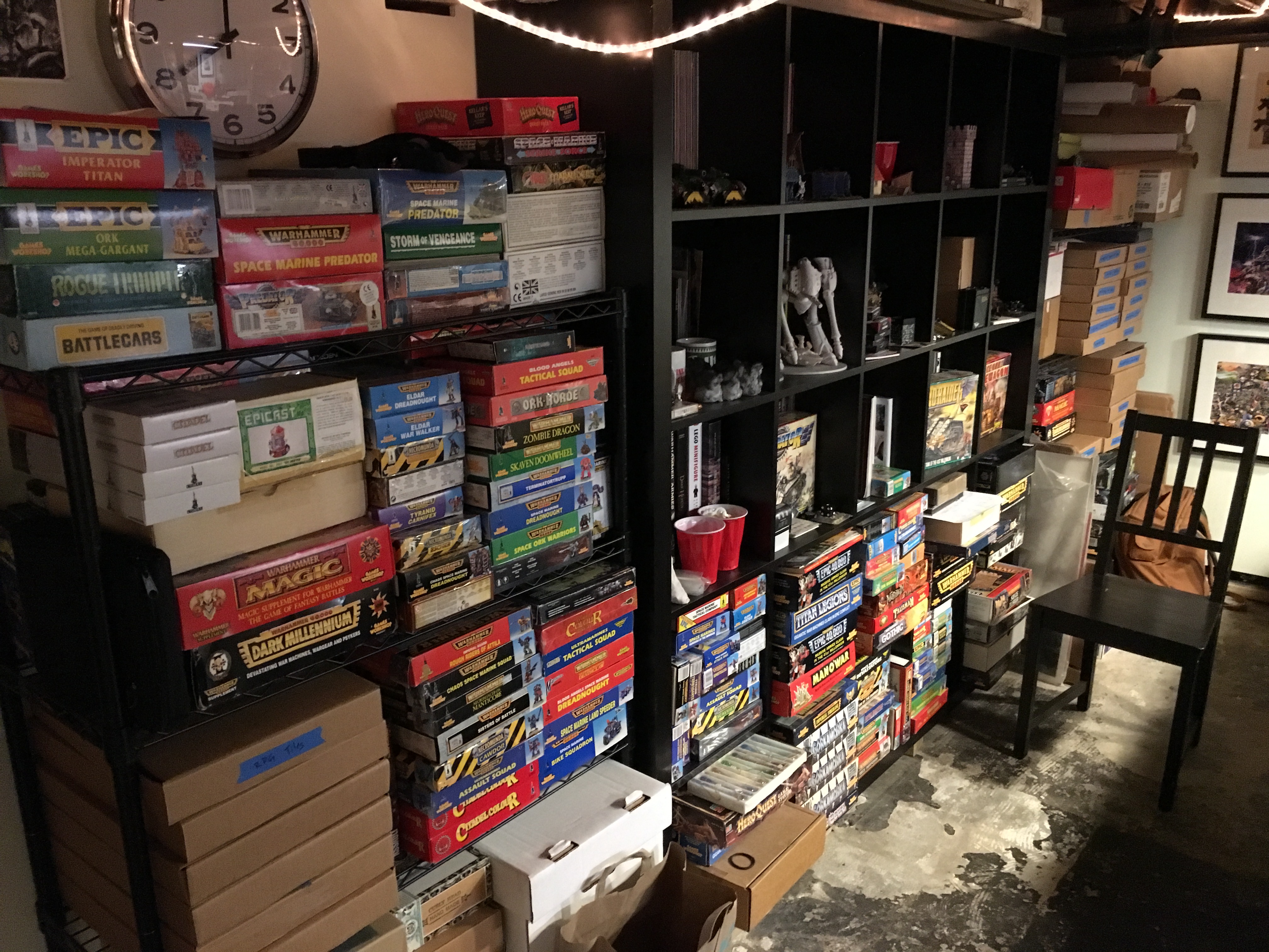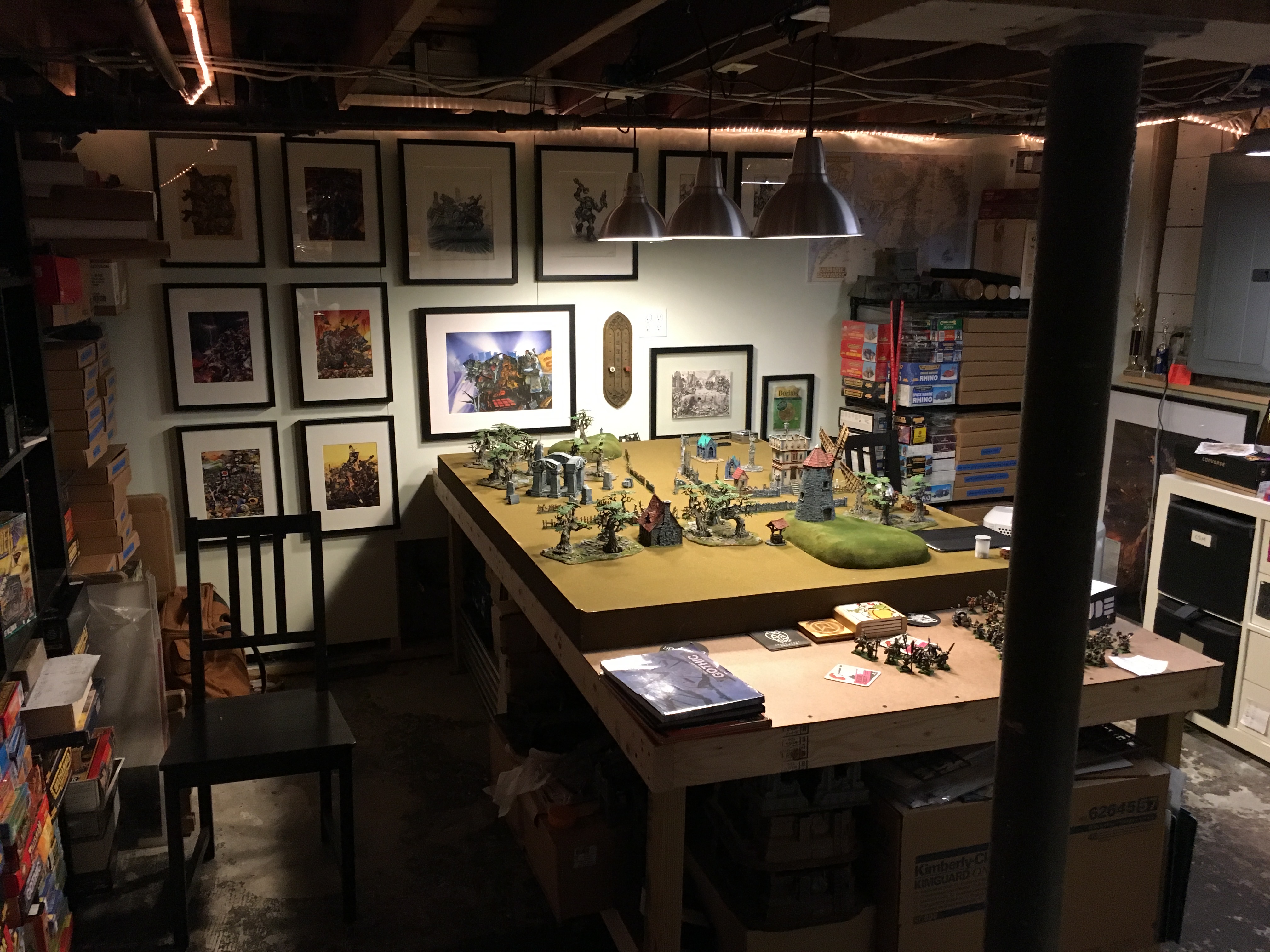 I've been fortunate to have dedicated hobby spaces for the last 10 or so years. When renting apartments we'd find places with 3-bedrooms and one would be used to contain my hobby stuff. When we bought our first house, I got half the basement and spent time semi-finishing it, building it out including a display cabinet built into a wall. It was a great space, despite the lack of headroom (I'm 6'4", so lots of ducking happened). It was around 270 sq ft and housed my collection and allowed for dedicated hobby and play space. It was a hard space to truly make nice, with a raw concrete floor, no extra space (read: closets), and no place to hide anything.
