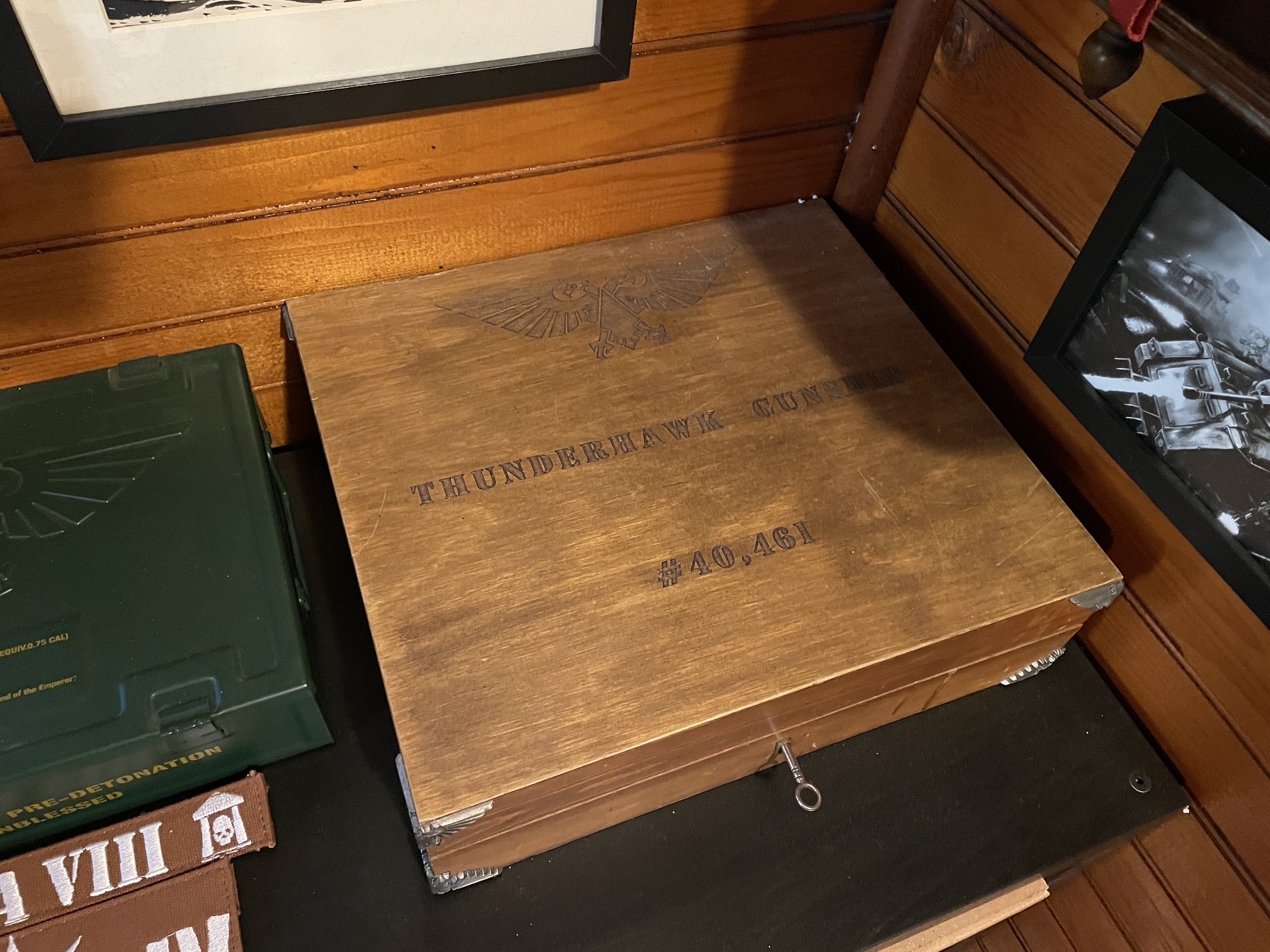 Next to that sits a small bookcase with some hobby and terrain materials in it (a few of the aforementioned cardboard boxes) and on top, yes, my metal Thunderhawk. I do plan to build it one year.