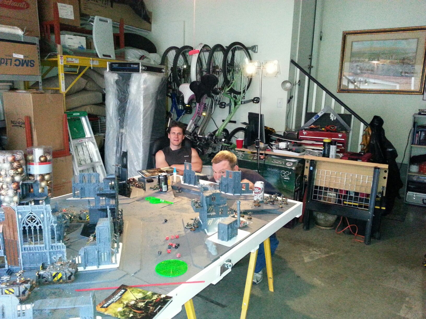 My dad and my friend Eric hanging out as I play Greg on the then-unfinished table in the garageOn that note, we played the vast majority of games in my parents' kitchen, where the island comfortably fit the slightly-larger-than-6x4' frame I'd built. This means the kitchen could get a bit messy at times, but there were a few huge advantages to this. The first is that the island, like most kitchen islands, is set higher up, with stools for access. As you build your spaces I cannot recommend this enough - BUILD YOUR TABLES HIGHER OFF THE GROUND. The standard height of a US table is between 28 and 30 inches, but you want your table to stand a minimum of 30" off the ground, and ideally something closer to 36", which is the (relatively) standard height of a bar in the United States. This will mean less bending over your table as you play, and for the older folks, much less strain on your back after long gaming sessions. Ask Greggles why he had to bow out of the Goonhammer US Open Narrative event after day 1 and he'll tell you it was because "40k is a young man's game."