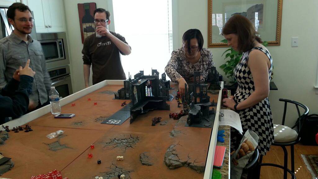 Our crew getting together for some kitchen slams\The other major advantage to playing in the kitchen is that you are in a space that is already equipped with decent lighting, a fridge, and lots of other countertop space (hopefully) for snacks. The downside is that you will not be playing on carpet, so having chairs in this kind of area is a must - standing around for 3-6 hours of gaming in bare feet on hard floors will also murder your back as you get older. I once wrote about the Paulus Campaign Apocalypse game we did at BuffaloChicken's house; that was an extremely fun 6-7 hours of gaming, drinking, and eating and the next day I had to attend a wedding but found I could barely stand. Fun times!