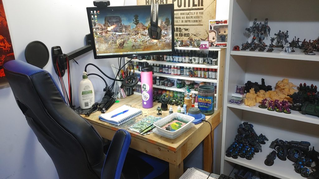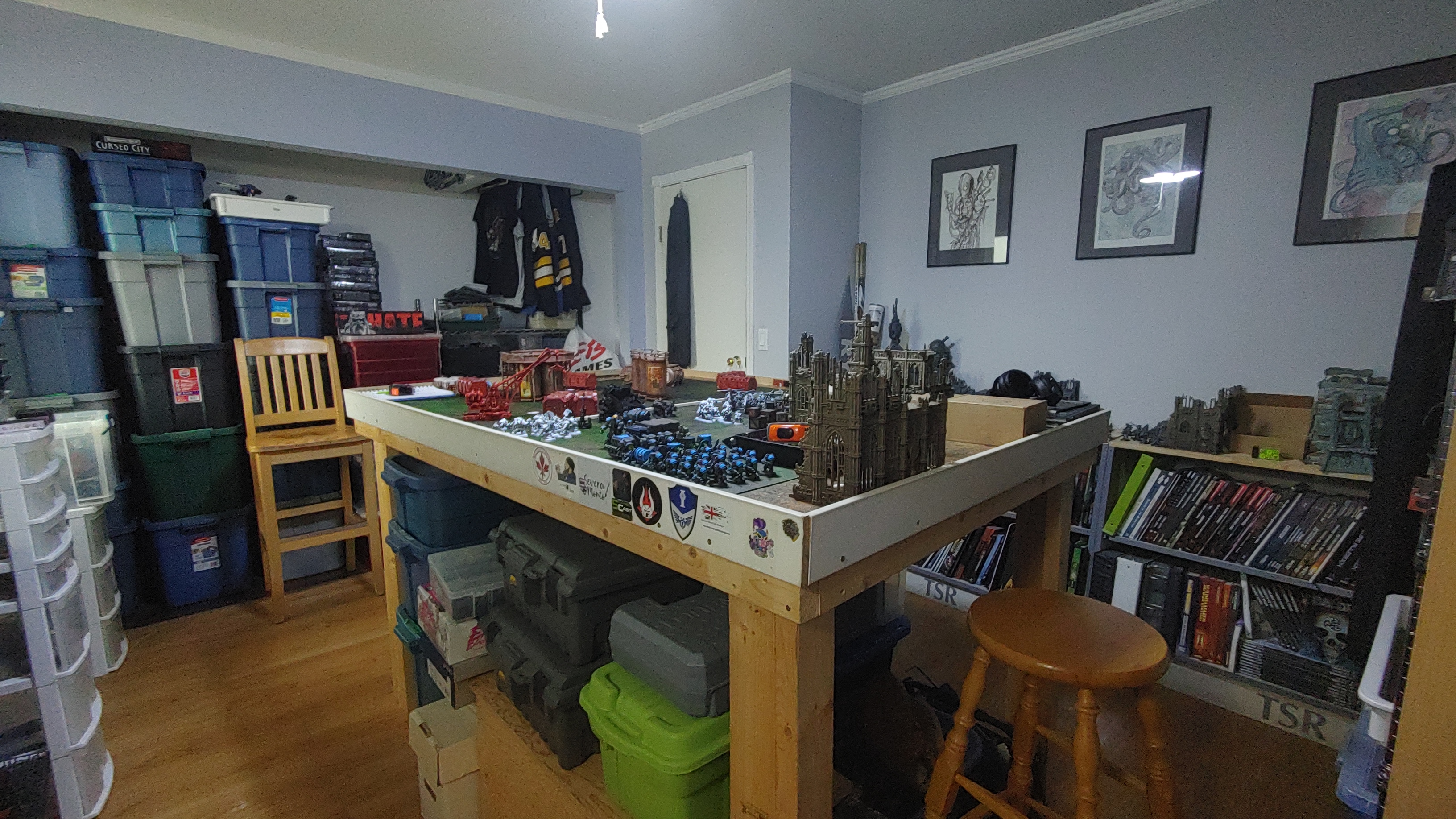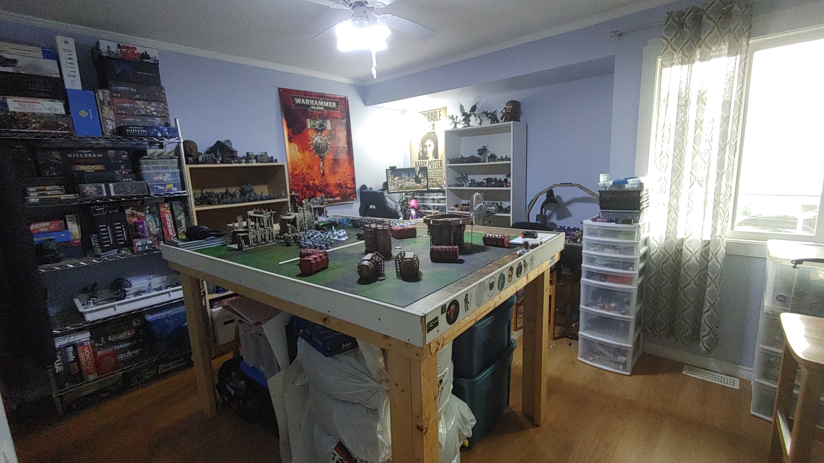 My husband and I always dreamed of having a space dedicated to painting and playing wargames. After we got married we decided to start the search for a bigger home. Previously we were living in a tiny, one room apartment, and as you can imagine this made every object in the space multipurpose. Plastic storage totes became the legs of a gaming table once stacked and a sheet of plywood placed on top. Kitchen chairs became painting tables. This idea is one that I still implement to this day. Storage of terrain and miniatures is as much a nightmare today as it was back then.