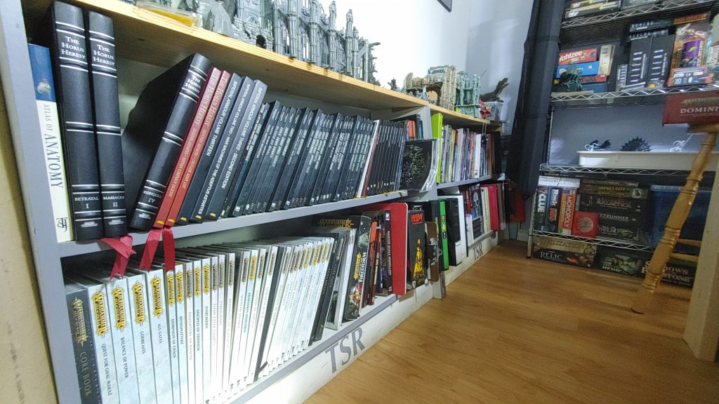 All of our savings went into buying this new home so we had to build or buy everything as inexpensively as possible. Thankfully, both myself and my husband adhere to the idea that function takes precedence over aesthetics and this opened up our options quite a bit. The hunt for used furniture began right away. Our TTRPG and wargaming rulebook/codex collection is quite large so we started there. We had a set of TSR branded shelves from our old place that we had salvaged from a local game store. These shelves were destined for the dump, but besides being kind of ugly, they were perfectly functional. They fit our new space pretty well, but we knew we could get a little bit more out of them. We fitted a top shelf on them and now we store our favourite terrain pieces there. We had a couple of tall bookshelves from our old place that also fit the space quite well so displaying minis was taken care of.