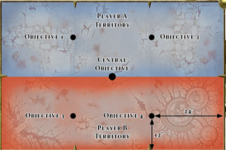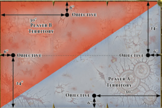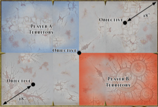 Another new battleplan with 6 objectives. Each turn the opposing player picks one objective in their territory to be the Primary objective for the turn. This is worth 3 victory points, all others are worth 1.