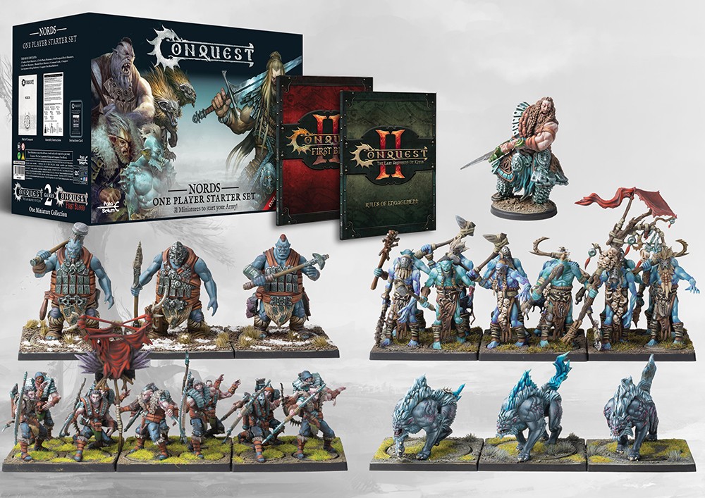 The main, and most obvious, way of getting into Conquest is with the Two Player Starter set. It's a great set to have two factions for yourself or to split with a friend, it even comes with two printed rulebooks so if you do split it there's no awkward "who gets the rulebook?" like with many other games. This set comes with the beginnings of a Nords army and a City States army with units that you'll always make use of, not just for getting started; there's really no waste in this set. Before delving into upgrades this set gives you 555 points of City States and 660 points of Nords. For your first couple games don't worry about this discrepancy or try and right it too much with upgrades! Just learn the basics and add those in later.