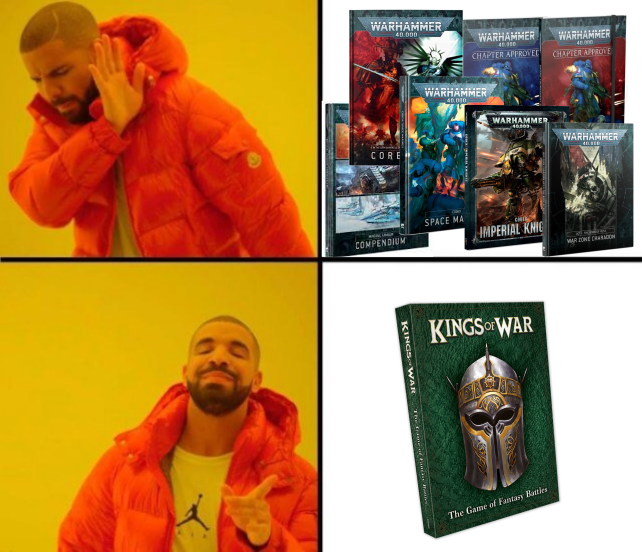 The library of books required for Warhammer 40,000 versus the singular tome of wisdom that is the Kings of War rulebook (we still love you 40K).