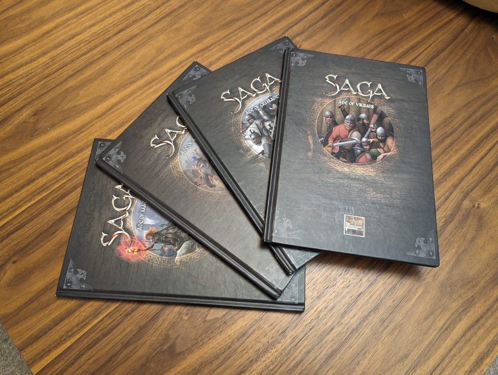 To start SAGA, you need a rulebook, an Age book, and a bag or box of figures. That’s it.Whilst SAGA uses bespoke faction dice, and has measuring sticks, you don’t need those at all – individual D6s can do the job for faction dice just fine, as there are only three facings on each SAGA die corresponding to pips on a D6 (Common = 1-3; Uncommon = 4-5; Rare = 6). A tape measure will do you just fine, and the Battle Boards for every faction are included with an Age book.