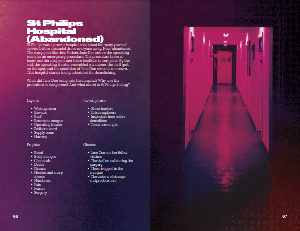 An example adventure, featuring possible frights and characters. Credit: Will JobstThe novelty of this concept is impressive, and easily the best selling point for the game. In order for this novel concept to really work though, “This Discord has Ghosts in it” requires all players to approach it at the game’s level and be very clear with what everyone wants before the game starts.