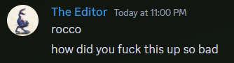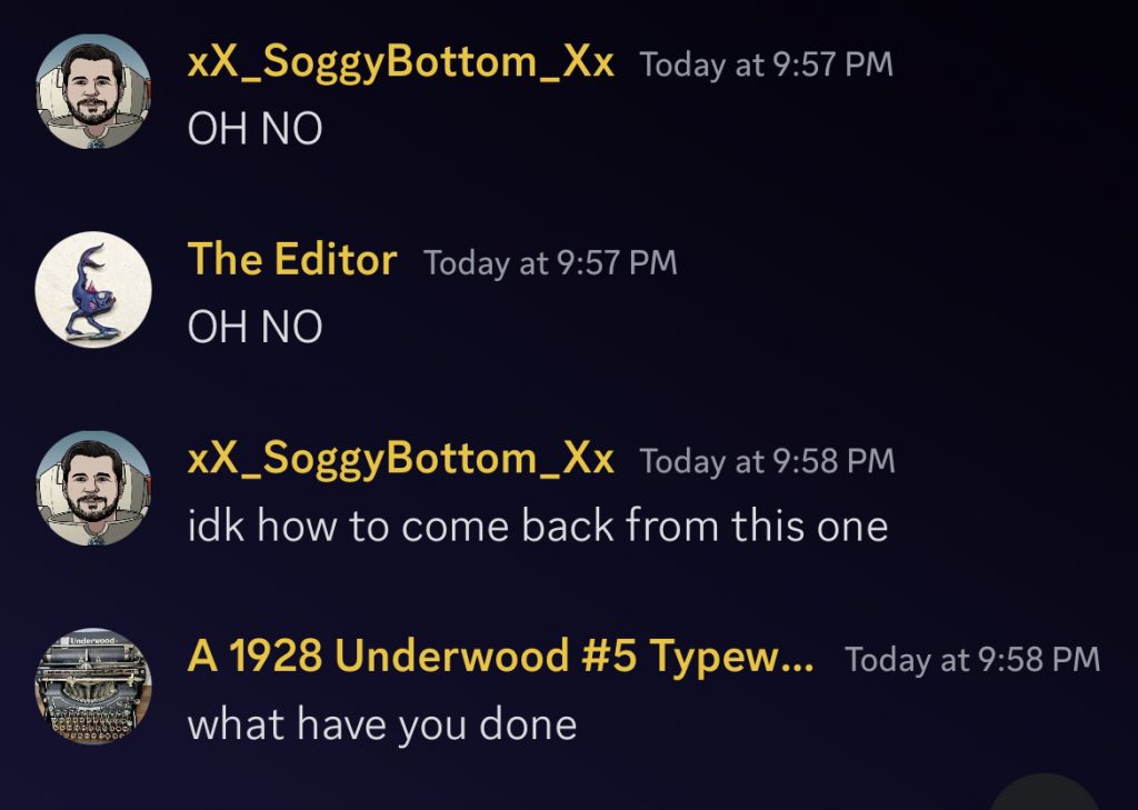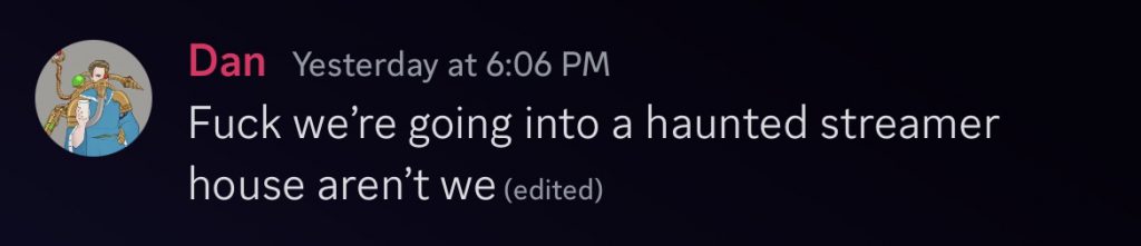 This wasn’t enough collaboration in retrospect, which is our fault. To run this game properly we needed to decide exactly why the investigators were there before the teams split up, exactly how goofy we wanted it, and precisely what everyone wanted out of the game. The intended experience of “This Discord has Ghosts in it” lacks the flexibility to leave anything up to player improvisation because of the asynchronous communication between Ghost players and Investigator players.