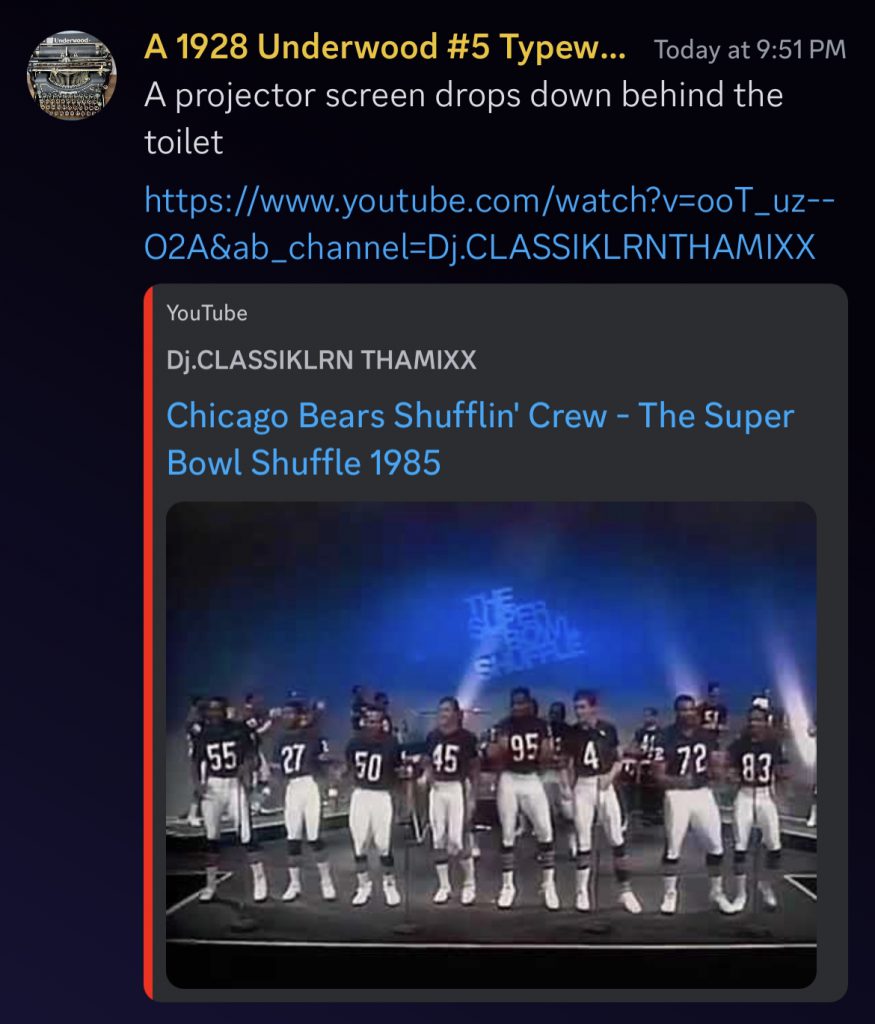 Just like any haunted house ride that pops up this time of year, when haunts work as intended, it’s a great experience. Condit, for example, was roleplaying as a ghost of a former member of the 1985 Chicago Bears, his wayward spirit possessing a typewriter in the home’s basement. He had bankrolled the streamers in life as a celebrity donor, but is stuck on this plane because he still doesn’t understand just what the hell streaming even is. Through sheer determination to be zealously committed to the bit, and clever roleplay and use of the frights laid out before the game, Condit managed to not once, but twice create a haunting that included Investigators being forced to watch the Super Bowl Shuffle, gripped in terror the whole time. It was an all timer gag that had everyone in stitches.