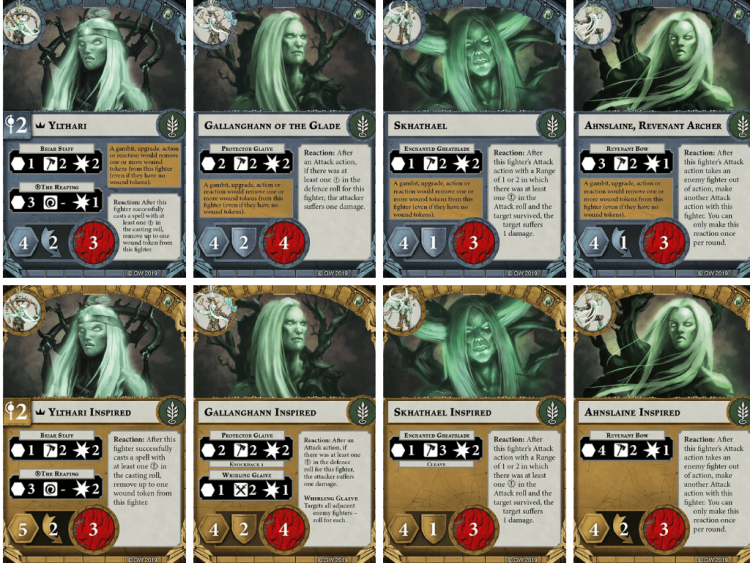 Ylthari's Guardians. Credit: Games WorkshopAll warbands in Underworlds have a condition by which they Inspire, becoming more powerful. Ylthari's Guardians all inspire in the same way (a wound token is removed from the fighter) though each changes in different ways. Exactly how they change isn't important right now, but generally speaking inspiring your warband is something you'll want to do. The benefits can mean the difference between victory and defeat. The other thing to note is that all 4 fighters have a Reaction ability printed on their card. Reaction abilities allow you to break the normal flow of the game, inserting an action in response to an event. In the case of the Guardians, three of them are dependent on rolling a Critical Success on an attack, defense, or spell roll.