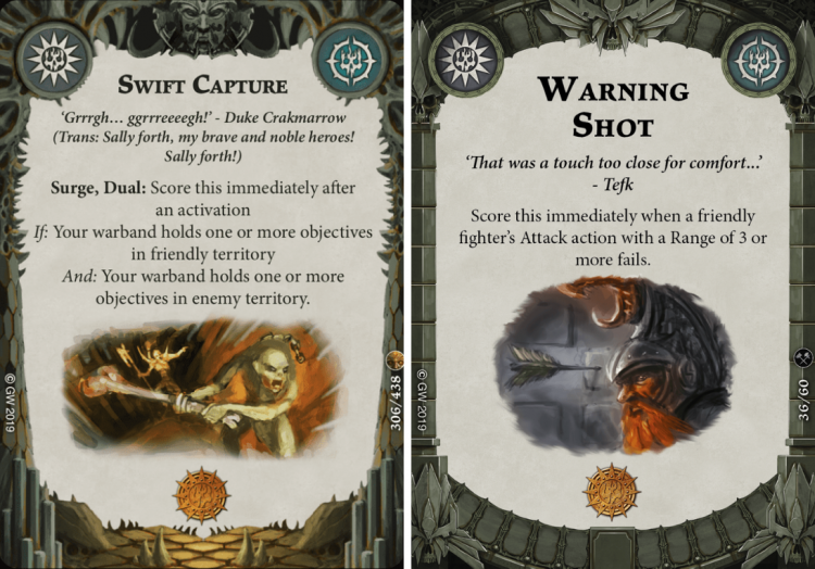 Swift Capture and Warning Shot. Credit: Games WorkshopSwift Capture requires 2 criteria to be met, but they should be pretty easy to accomplish. Warning Shot may seem like a weird one. It doesn't match our new deck focus and you never really want to fail an attack. However, sometimes you just need to put cards in your deck that are easy to score. Ahnslaine and Ylthari both have Range 3 attack actions; this should be a dependable score.