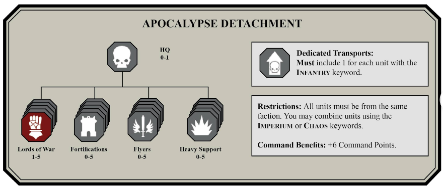 The army problems were easy to solve - for some reason people seem to want to bring infantry to games of Apocalypse, when these models just slow the game down and really don't matter all that much. I still wanted some - land raiders and terminators seemed like fair game - so I created custom detachments for people to use that would give them a lot of CP (note: This was before Battalions gave you +5 CP) while also giving them the ability to bring all the titans, artillery, and jets they could muster. I'd later add on to this by letting players bring Supreme Command, Flyer Wing, and Outrider Detachments, but keeping the "you need 1 transport per INFANTRY unit" stipulation.