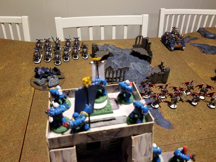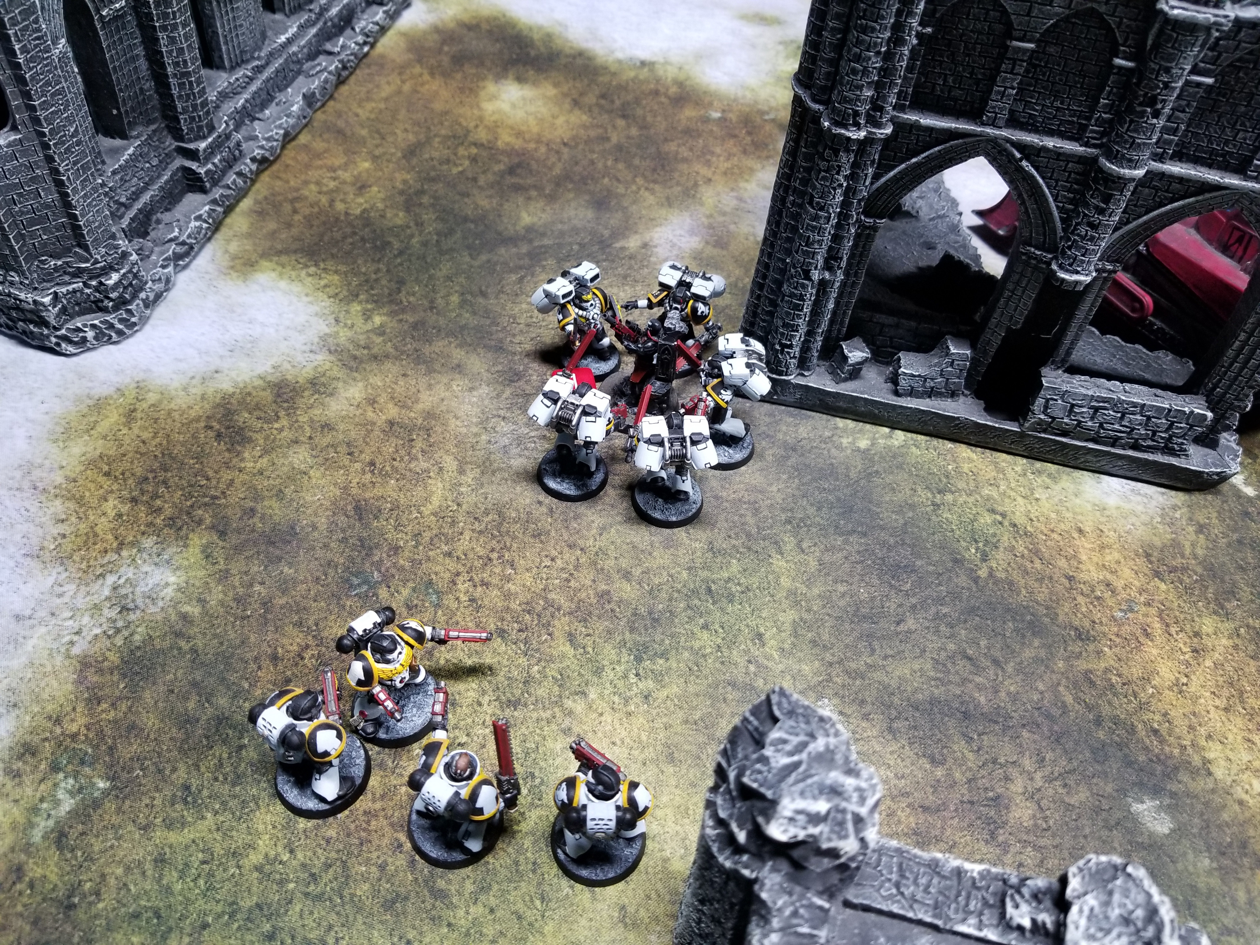 Sternguard looking down on what will almost certainly not be a challenging battleWhat followed was the most terrible, awful, no-good, very bad game of Warhammer 40k I have ever played. At no point did anything in this game go my way. My reserves rolls kept key units off the table. I failed every charge. My terminators failed to wound. Every plasma gun exploded, even after CP re-rolls. Every shot I needed to hit one of the fortifications whiffed, including one memorable moment where my Raptors missed the bastion they were standing on at the time.