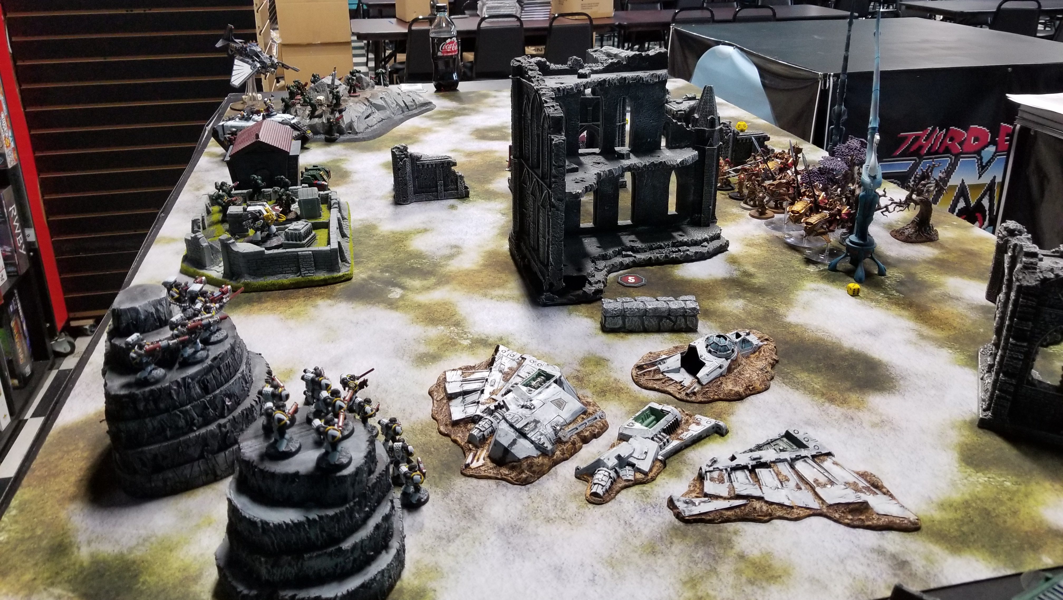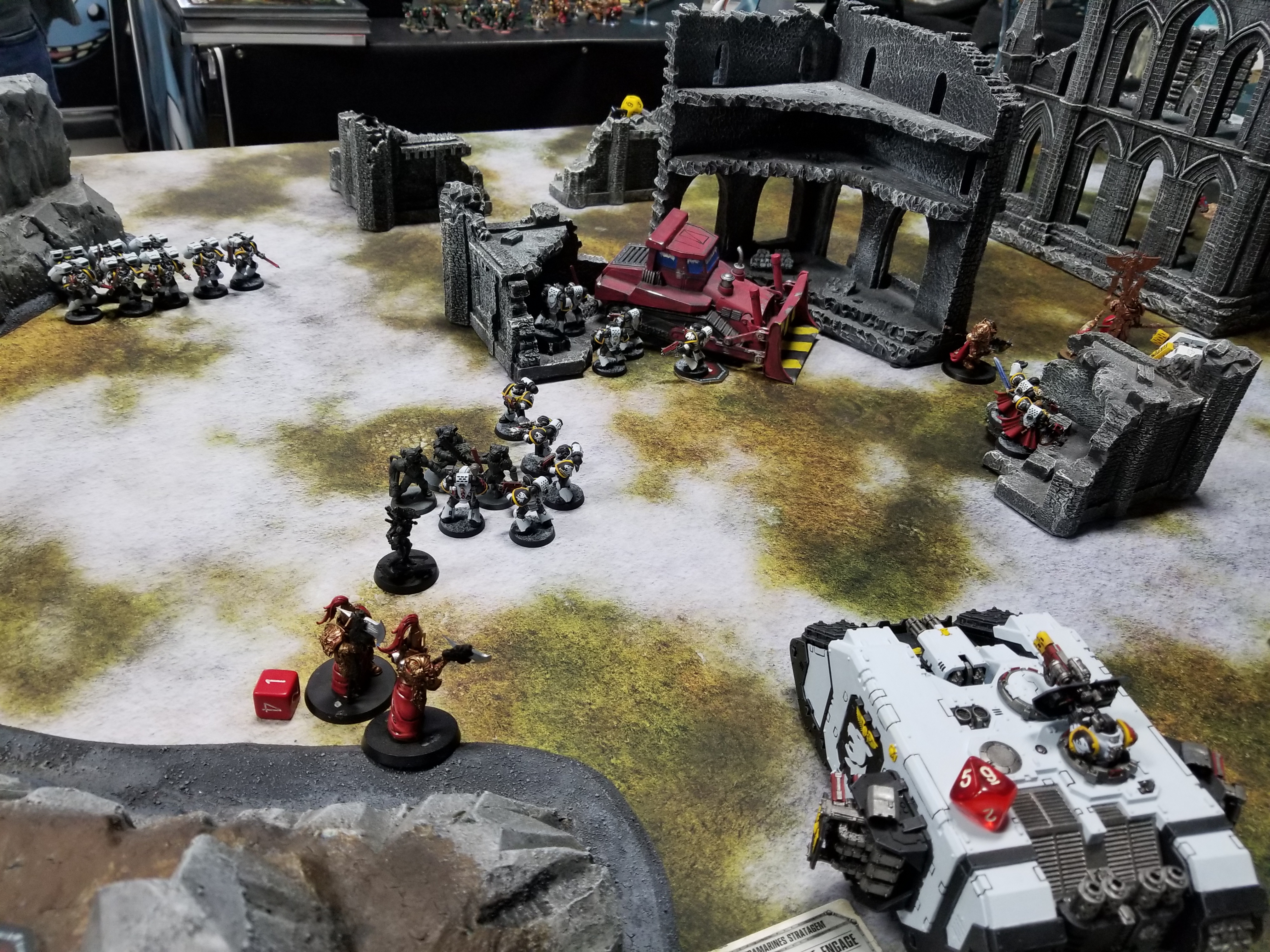 One of my few games in 8th with the White Panthers and the only game I played where I was the marines player using the 2019 marine codex.My wife and I have a deal of sorts in place: Every year, we visit my family for Thanksgiving, and we visit her family for Christmas. This makes a ton of sense, because my family is much bigger on cooking and football than hers. That means that every Christmas, I'm back in the lower Maryland area, and looking to get some post-Christmas games in before we drive back up to New York. Third Eye Games in Annapolis is one of the better stores on the US Northeast, offering a large, well-lit space with lots of tables, great terrain, friendly staff and decent parking, and so we try to meet up there.