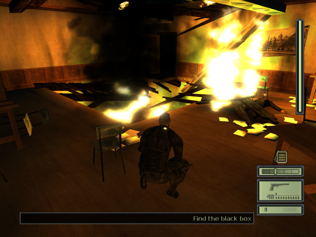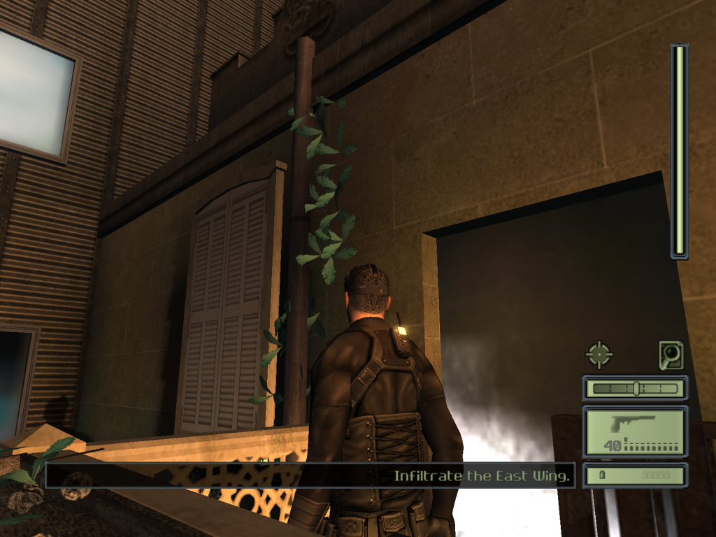 The other big problem is that in 2002 we’re still a few years before anyone really figures out coherent, blended mantling and traversal over intentional, bespoke terrain -- you know, easily stepping up on a ledge to grab a zipline, easily running-jumping-catching a ledge, that sort of thing. Making it work will come out of the Assassin’s Creed series also from the mega-studio Ubisoft, and making it look good will come from the Uncharted games from Naughty Dog, among others. But in this game, traversal is not still a smooth, solved problem, and you’ll run into situations where Sam will gormlessly do the jump animation, you won’t be in the right place for that jump animation, and he’ll weirdly fall off a cliff or down into city streets or into the middle of a room full of guys with guns. That’s just how it’s gonna go for a while, in video games. And while aiming your gun is much easier with KBM (for what that’s worth, given Sam’s inherent bullet drift as described above), pressing the right buttons to properly jump and mantle is much easier on a controller. Especially since this game thinks crouch should be on C instead of CTRL, which you’re thankfully able to remedy in the settings menu. No subtitles, though.