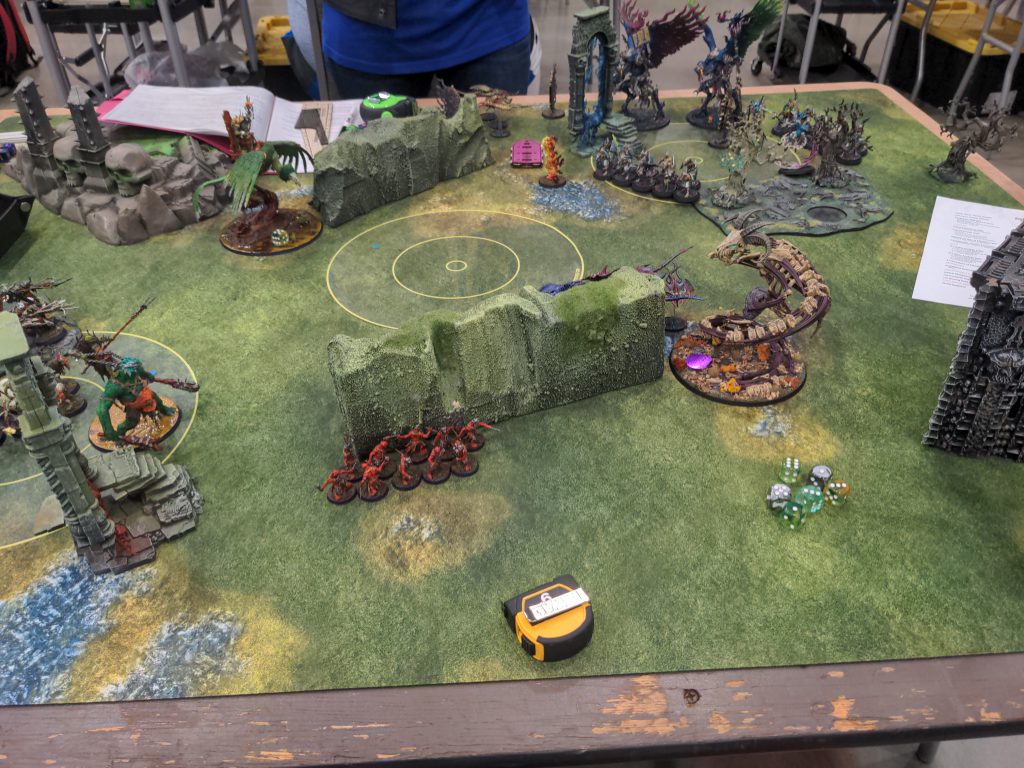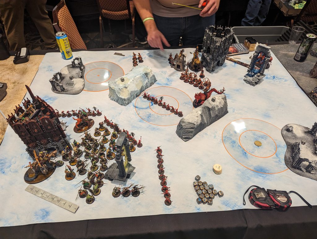 A very fine and very fun game of Age of Sigmar played in 2023 in Las Vegas. Note the foam blocks in the middle of the table.While different tournament circuits exist (including the Unified Tournament Circuit) and reward a best player the ITC has made getting a token and submitting results fairly easy and it is one of the most widely used player ranking systems. The ITC has also been embraced by Games Workshop with an announcement last year that top performing players in the ITC would receive prizes and provide feedback on the balance dataslate.