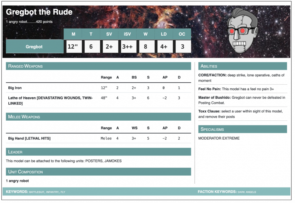 We're working on finishing off the missing pieces of our book support for Crusade rules in 10th, which right now includes the custom chassis mechanics for Chaos Knights and support for the Imperial Agents Codex. Look for those to drop in the next month.Data Slate: Matrix Builder and TTBA Data