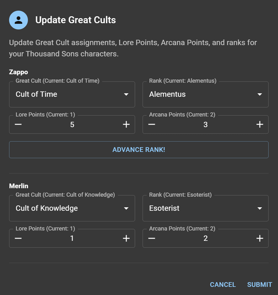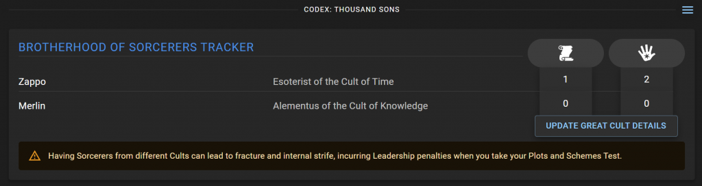 We've added support for the Crusade rules in Codex: Thousand Sons! You can now pick a great Cult for each of the Psykers on your Crusade Roster, track their Arcana and Lore, and chart their progress. In a similar fashion to our World Eaters update, your roster Dashboard will show all of your Sorcerers and their current rank, letting you see who's who at a glance.