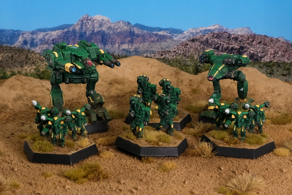 Black Lanner A, Fire Falcon Prime, Corona Battle Armor, and Salamander Battle Armor. Credit: Valk.
