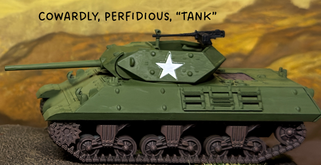 The cowardly, perfidious tank has two ranged weapons to make use of: M35 tank gun and M2 heavy machine gun. The M35 will fire as a crossbow but not use an extra dice to fire, gets +3 on its attack roll, and will automatically cause a pierced result. Noble Defenders cannot choose to Block an M35 shell either, they can only Dodge against this attack. Being cowardly and perfidious doesn’t stop it from still having a massive gun. The M2 fires as a bow with no bonus but can shoot any number of times each turn and the Noble Defenders may Block with their shields as normal.