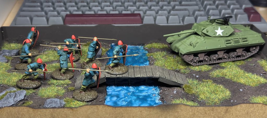 When it came to painting these I opted for full accuracy. Not historical accuracy, of course, but banner image accuracy. The Norman Noble Defenders are painted in bright blue, green, and orange-red with brown boots and spears while the M10 is just green and brown with a black M2 .50 cal machine gun and a white star. Simple. This almost hurt me to paint just covering chainmail, pouches, belts, and any other details in a simple block colour. It was freeing, too. If you’re trying to achieve full historical accuracy with these rules then you need to do the same or feel the shame of a gamer forgoing accuracy.