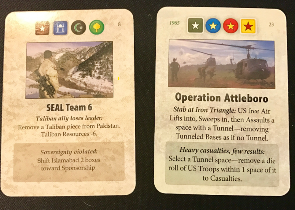 As you can see in the bolded text above the game instructions, each event has a different “interpretation” based on from what perspective you view the event. Credit: Raf CorderoSeal Team 6 either eliminates Taliban operatives in Pakistan (normally extremely difficult) or it angers Pakistan and moves them towards opposition with the Coalition forces. Operation Attleboro - a Fire in the Lake card - provides either a “Stab at the Iron Triangle” and the removal of VC forces or “Heavy casualties and few results” for the US. This two sided approach to the conflict is a big part of what draws me to this series of games. If you’ve listened to our podcast for a while then you know by now that Charlie and I have a lot of fun playing games, but we also think games can be for more than just fun.