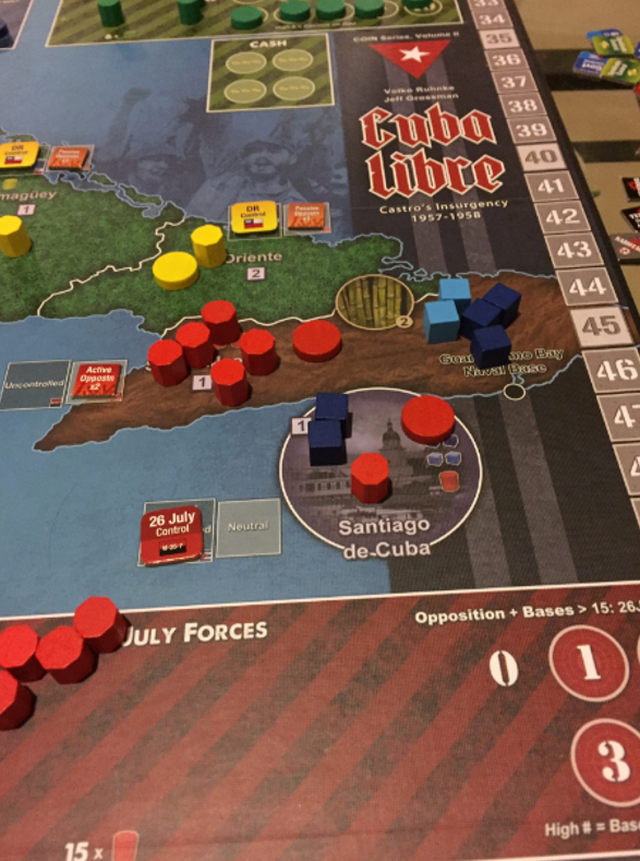 That push and pull between allies and enemies drives the play COIN games up off the table into the space between the players. Trust, real trust, is required among allies which makes the inevitable betrayal all the more painful. Cities fall, people die, and revolutions are quashed under the weightless words of “Sorry, but you’re going to hate me after this move”. While the details change from title to title to match the setting, the social play does not. Cuba Libre, the simplest of the first 5 titles, doesn’t have the cross-linked goals or even the victory conditions directly shared by allies in Liberty or Death. This doesn’t affect the drama of play.