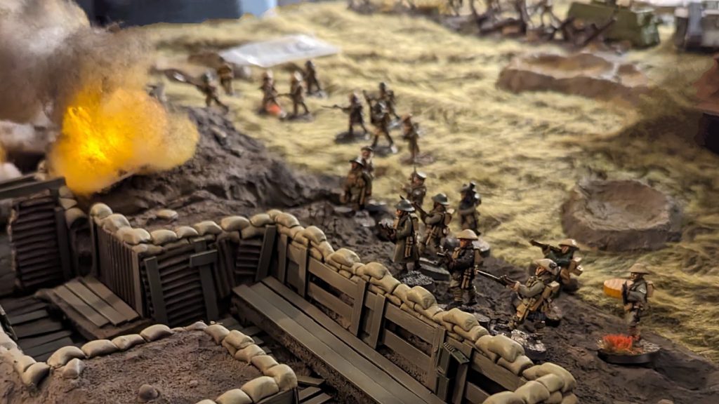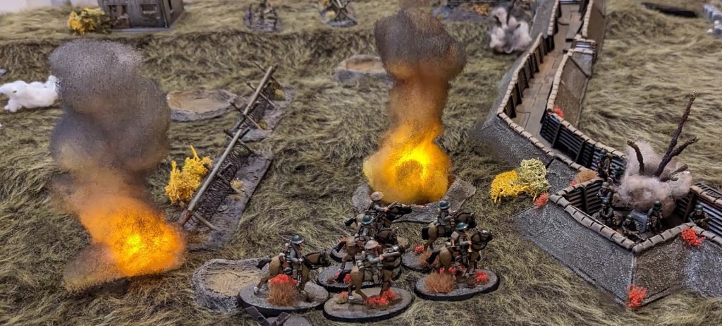 Sam: Yes, so to get round this artillery problem, the game breaks artillery up into three chunks. Firstly, a couple of scenarios include pre-game preparatory bombardments as scenario rules. For this purpose, we assume that the defender’s force are the ‘survivors’ of the preparatory bombardment; they will suffer some pins (diced for just before the game begins), representing the dislocation of the bombardment and ‘race to the parapet’, but no casualties.