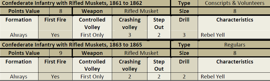Even conscripts were trained to do controlled volleys, so I give them Controlled Volley: Always (for both Union and Confederate). Other than that I leave them as is.