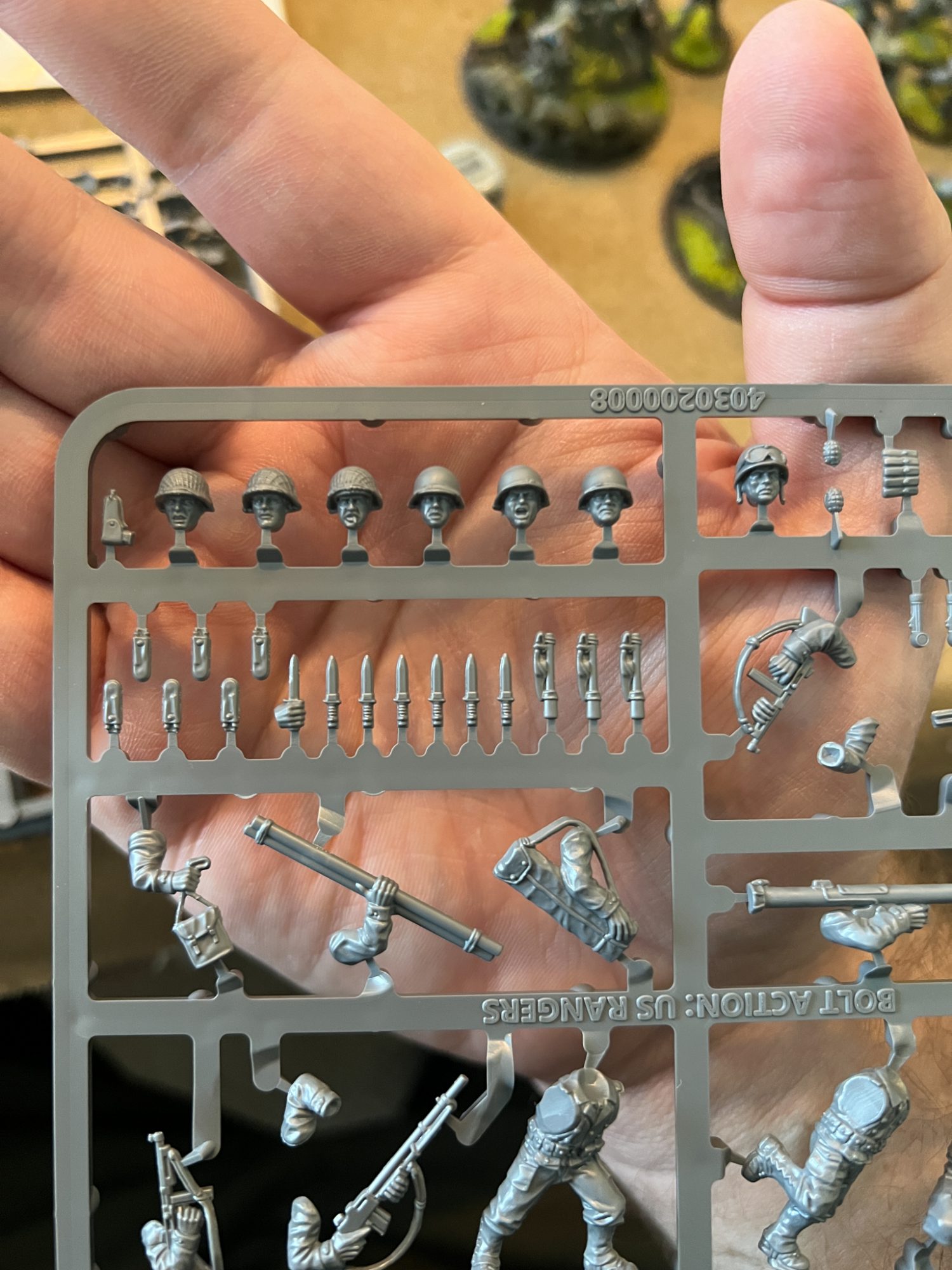 The box itself is great. We have some wonderful sprues that feature a variety of standing, kneeling, or running poses and weapons aplenty. In addition, the new Rangers box also features head sculpts based on the boys of Captain Miller’s 2nd Ranger Battalion from the film Saving Private Ryan. There are plenty of additional bits to really flavor your units - flashlights, hatchets in sleeves, bags, pouches and the M1928 haversacks (with and without an entrenching tool). I will take a moment here to point out a few things I found odd about this kit. Primarily bit 47, a left arm holding a helmet. While it makes for an amazing, cinematic model, this kit doesn’t come with any bare heads! If you only bought this kit, your only option would be to build a fellow holding a helmet while wearing one. Luckily I have a ton of bits left over from my Early War German Army and I managed to find a helmetless head among them. I can definitively say my favorite bit in the entire kit is the Ranger head with the M44 goggles.