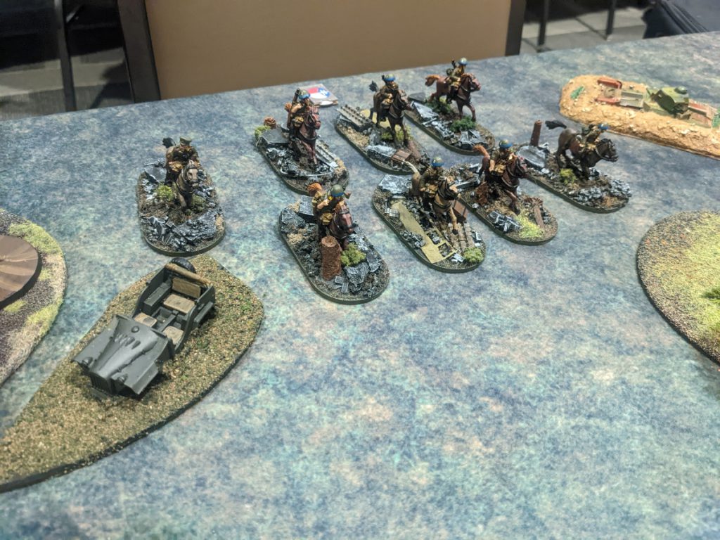 An Italian anti-tank team (28mm Gaddis Gaming) springs an ambush on an unsuspecting Sherman tank! (1/56 scale Warlord/Italeri) Note the larger diameter of the figure closest to the bottom of the photo, denoting the leader of the gun crew. The gun itself is also fixed to a base, with the area just behind the wheels left free of bushes or grass. This lets me put troops up close – appearing to service the gun – while still allowing for individual casualty removal. (Credit: Marc Renouf)The Savoia Cavalleria Squad were Italy's answer to German inquiries into what in Italy's military wasn't from World War 1. Despite being a rather outdated infantry formation by the end of the Blitzkrieg, the steppe of the east gave cavalry a second chance to shine. The Cavalleria make themselves an appealing unit through their special rule Carica! allowing them to make one further assault after a successful close-quarters combat.
