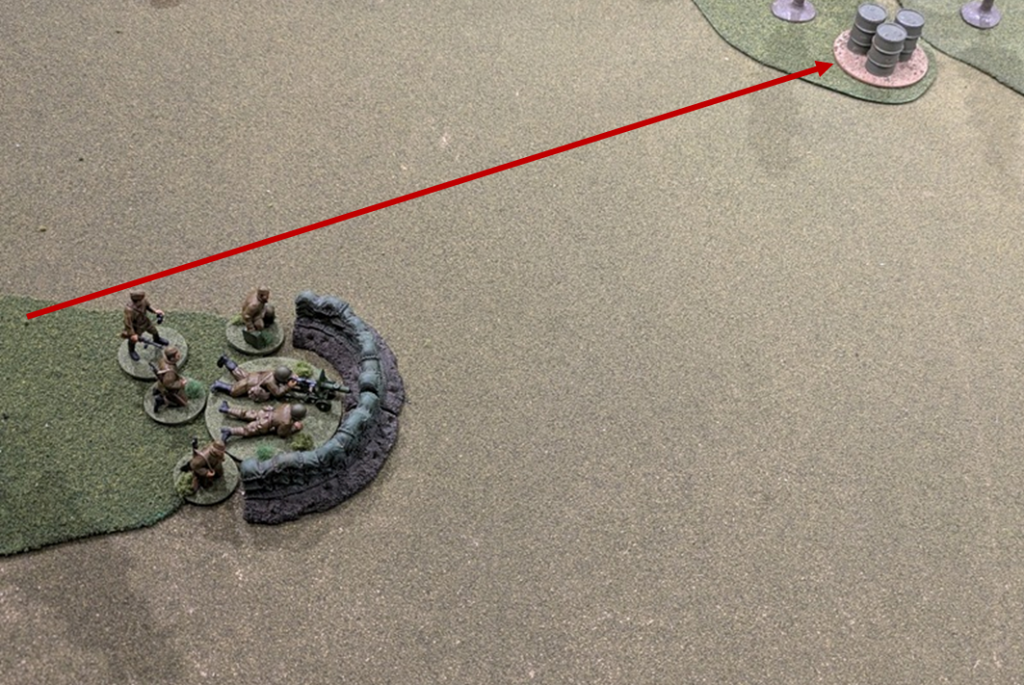 Not far enough! (credit: Ilor)Meanwhile, the German First Squad in the woods north of the road was trying to extricate themselves from a tangle as well. They tried to pull back deeper into the woods to break contact with the Soviet heavy squad, but they too rolled extremely poorly and after Shock was factored in only moved an inch, meaning they were still visible. Taking matters into his own hands, the German Leutnant deployed in the objective building, rallied off a single point of Shock, and commanded the German 2nd Squad's LMG team to fire using the maschinengewehr special rule.