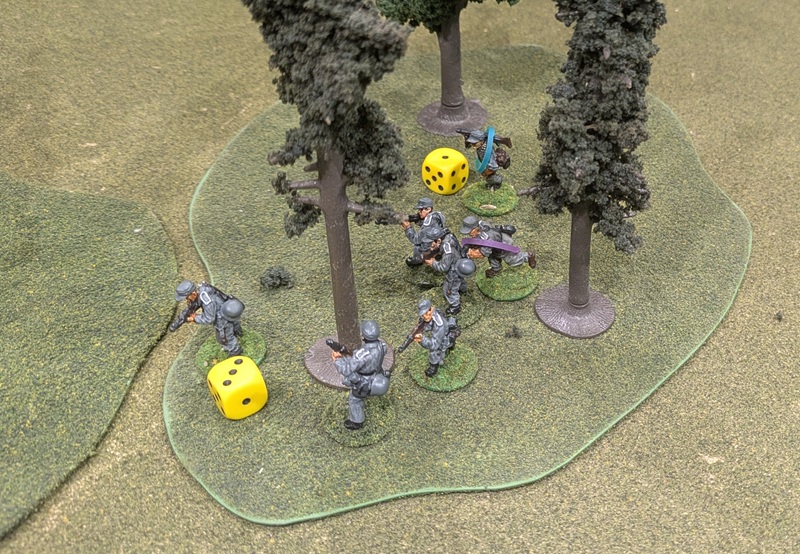 The standard Soviet infantry rifle platoon from this era has learned some lessons from the German panzergrenadiers, and sports a squad that has two Degtyaryev LMGs. This represents a decent amount of firepower in one place. Unlike the Germans, however, Soviet doctrine was to keep each squad together as a single unit and not separate it out into teams. (credit: Ilor)With the Soviets crashing headlong into the center of the table, the Germans responded in kind. German First Squad ran into woods in front of them, and it was here that Rob encountered one of those aspects of Chain of Command that I absolutely love - the uncertainties associated with movement. Given that these were dense Ukrainian forest, the visibility into or out of them is only 4". His goal was to get the German squad into the woods, but not move so far that he could be seen by the Soviet heavy squad (with its twin Degtyarev LMGs). But given the distance he needed to cover, he opted to roll 2D6 rather than just 1D6, and in so doing rolled like 11". In Chain of Command, unless there is a specific, identifiable feature on the table that you don't want to move beyond, you always move the full distance. Stopping at an arbitrary point on the field (or in the middle of the woods) is not allowed. And so it was that Rob's First Squad found themselves just over 1" in from the edge of the wood and well within view of the Russian heavy squad (albeit still in light cover).