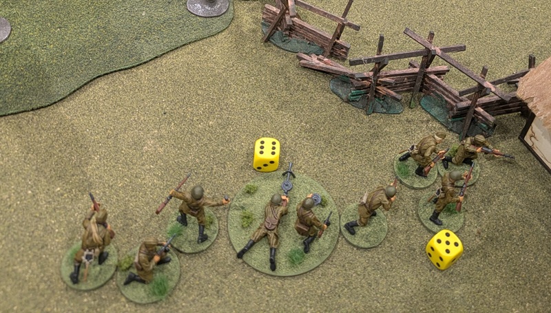 With more Shock than men, this squad is now "Pinned" and unable to move. Basically, these guys are kissing the dirt and thinking about trying to make themselves as small as possible. Fortunately, being Pinned increases your cover by one level, so by hugging the ground this unit is treated as being in soft cover even in the open. (credit: Ilor)Worse, this was the first of a double phase brought about by a Turn End! In the following phase, more fire was directed at the pinned Soviets. Staggeringly, for as many dice as were sent their way, the combination of the rail fence and the fact that they were now Pinned (which improves your level of cover by one rating) meant no further casualties were inflicted - though the Shock continued to mount!