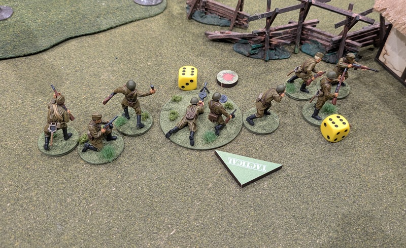 Now with twice as much Shock as men in the unit, the doughty Soviet First Squad finally breaks and makes for the rear. (credit: Ilor)Aside: In the First Edition of Chain of Command there was an ambiguity as to what happened to a unit after it broke; it couldn't move, but stacking more Shock on it didn't have any further effect on Force Morale. Often, this resulted in Broken units either being completely ignored, sometimes in them being stuck out in the open and being bullet magnets as the opponent fished for Leader hits. 2nd Edition has now clarified how these units behave - if a Broken unit takes fire and accrues any further Shock or casualties, it makes another 2D6+6" retreat move. In this way a Broken unit can sometimes move back to a covered position, but if also means that sometimes your opponent can effectively blast a unit and make it retreat off the table entirely. This in turn is important because a player must check for Force Morale loss the first time a unit breaks, and again once any attached leaders are removed from the table (either if the unit falls back past a board edge or when a Turn End sees all Broken units removed from play). As such, broken units are a little bit more of a liability in the new edition, which I think is a good change. End of aside.