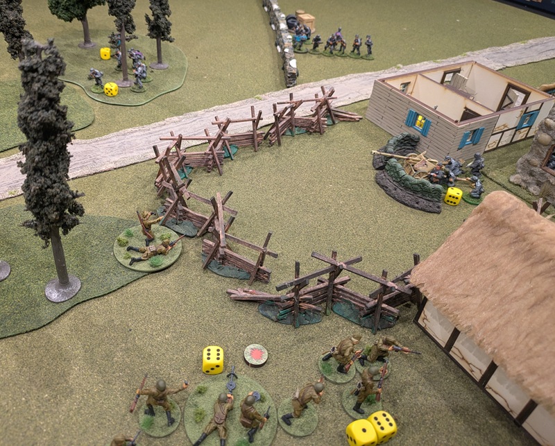 Though they don't make it over the fence, they can now see the German rifle team north of the road just a little better. (credit: Ilor)The Germans' Command Die roll is abysmal and nets a number of CoC pips but leaves them with relatively few deployment/activation options. They fire First Squad's LMG at the Soviet heavy squad but this fire has no effect. Sensing things rapidly spiraling out of control the Germans deploy from the objective JOP, with their LMG in that building and the rifle team taking up firing positions in the nearby stone house. Both teams fire on the Soviets just beyond the fence, inflicting a little Shock. Soviet MMG on overwatch returns fire, inflicting a point of Shock on the LMG team in the objective building (the only team it can see).