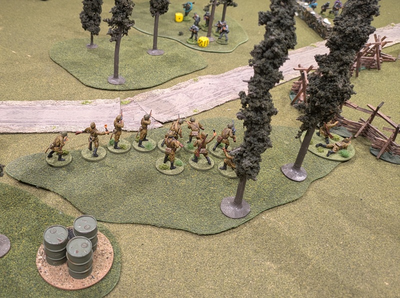Soviet scouts lead the way, followed by the remainder of their squad. (credit: Ilor)The follow-up roll gave the Soviets their fifth pip towards a Chain of Command die but no 1 to activate their scouts. In the new edition of the game players have the option of expending a single pip from their Chain of Command total to do a "Recce Action" to activate a scout team, rally Shock from them, or put them into the Tactical stance, but at this point John was so close to having a complete CoC Die that he didn't want to do that - I knew he was already thinking about moving a Jump-Off Point forward. Unable (or unwilling) to activate his scouts he instead opted for audacity; exhorted to run by their Mladshiy Serzhant, the Soviet First Squad overtook their own scouts, sweeping them up as they passed. The movement roll was a banger and the Soviets were able to occupy the woods in the center of the table just south of the road. Finally, the Soviet Heavy squad was deployed from the same JOP that First Squad had used, though deploying with a 2 meant they could not be placed on overwatch.