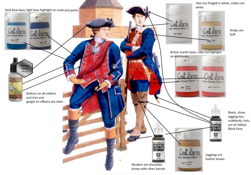 A depiction from Osprey - my troops are painted like the rightmost uniform.In terms of Sharp Practice, they’re the main part of a ‘settler defense’ force. The author put together some basic forces for each period and they’re the ‘regulars’ so to speak in a force defending settlements from French and Indian attacks. We’ve used these forces as we’ve started playing the game but they’re not the end-all be-all – you can add to them since TFL also included a points system.