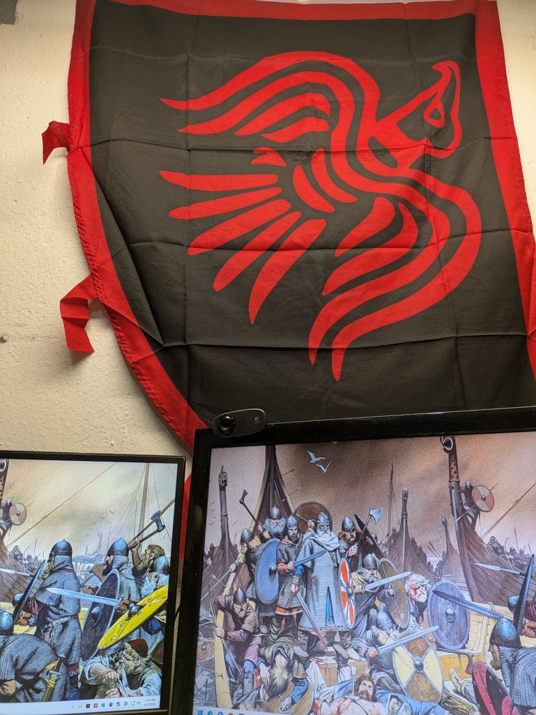The raven banner hangs above my battlestation in the basement.Time to return to SAGA. Fire up some ">Wardruna and throw some furs down to do some light reading.