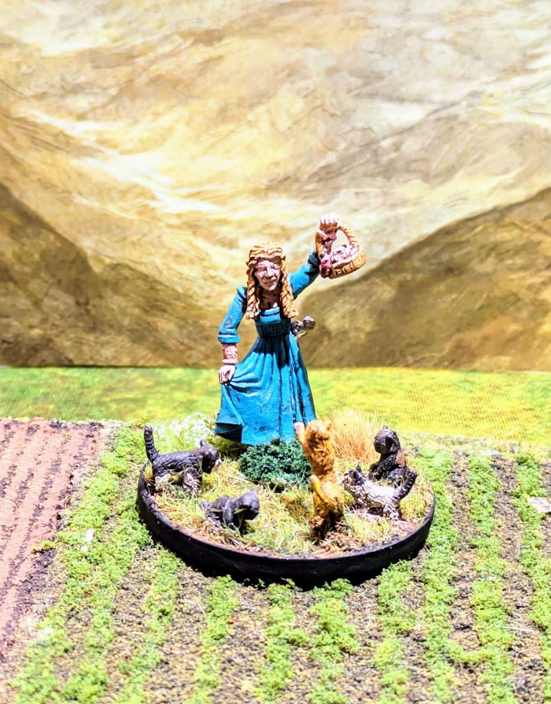 Fish Lass Maria (& pesky kitties) from Bad Squiddo. Credit: Michael O "mugginns"My daughter's hobby is cats, so I definitely had to get a mini for her with cats on it. Fish Lass Maria from Bad Squiddo is awesome - she's carrying some fish from the market while being harassed by a squad of cats and kittens. I gave her a scabbard and then painted each cat like a cat we have right now (three of them) and two who we had forever and passed on. She'll be the lead shieldmaiden for my daughter's warband, heading up the Warlord duties while fending off a passel of cats.