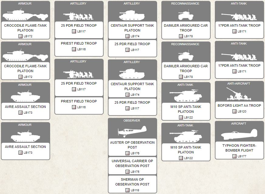 Support options are a combination of single choices of “black box” units to more specialist units that don’t exist in any formation. So our British Sherman army could start taking Crocodiles, static guns and air alongside their Shermans.
