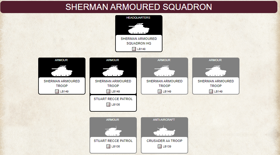 D-Day British Sherman Armoured Squadron. Credit: BattlefrontA formation will represent a specific type of company, and contain mandatory (‘black box’) units, as well as a series of optional ones. For example, a British Sherman Armoured Squadron has a mandatory HQ of 2-4 Shermans, a mandatory troop of two Shermans and a Firefly or three Shermans and a Firefly and then a third mandatory unit that is either the same Sherman options again or a recce patrol of 3-4 Stuarts. Then in the optional units there are two more troops of Shermans, one Stuart recce patrol, and a pretty ahistorical Crusader AA troop.