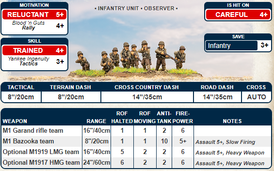 US Battle Weary Rifle Platoon. Credit: BattlefrontFor the most part it’s fairly intuitive: infantry and armour share the same basic stat block with motivation, skill and ‘is hit on’ values working in essentially the same way. On top of this infantry have a flat save and tanks will have specific armour values for their front, side and top.