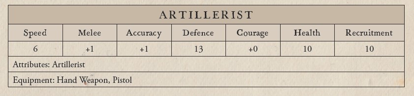 The Artillerist statline. Credit: Osprey GamesThe stat blocks are fairly simple. Speed is how far a model can move in inches - most are six, if they're wearing a breastplate they'll be at five. You're only able to move at your Speed value once per activation, but you can use your second action to Sprint - you make a check, rolling two dice. If its 11 or higher, you can move a further 4". If it's 10 or lower, an extra 2".
