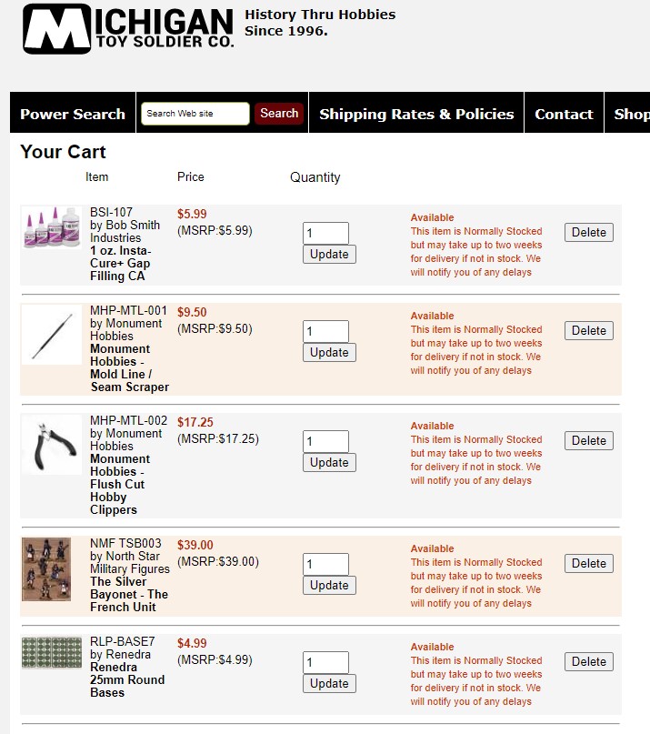 A sample order of what I'd get to start a unit for The Silver Bayonet. Credit: Michael O "mugginns"If you've never worked with historical minis, it's important to know that you'll need bases for your guys. They're cheap and you have a lot of choice as to how you want to do it. I've provided a sample order of how I'd get started above - glue, nippers, and a mold line scraper are all included and we'll get to those.