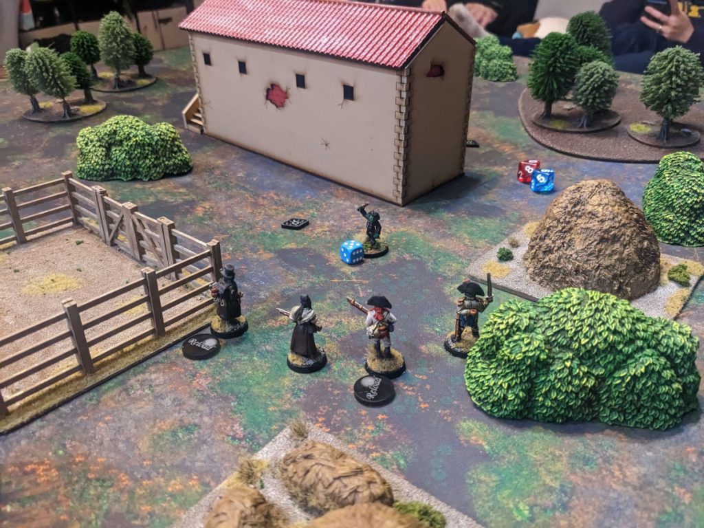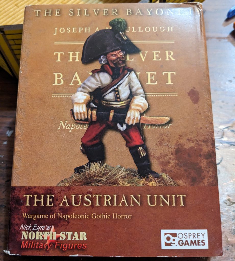 The Silver Bayonet is a warband level game (think, 6-8 guys) where you put together, paint, and play with your Napoleonic troops from pretty much any country that participated in the war. It uses individual model activations, alternating between one half of a warband, then the other warband entirely, then one half of the remaining warband. Dice used are entirely D10s. Each model can usually survive being hit 2-3 times.